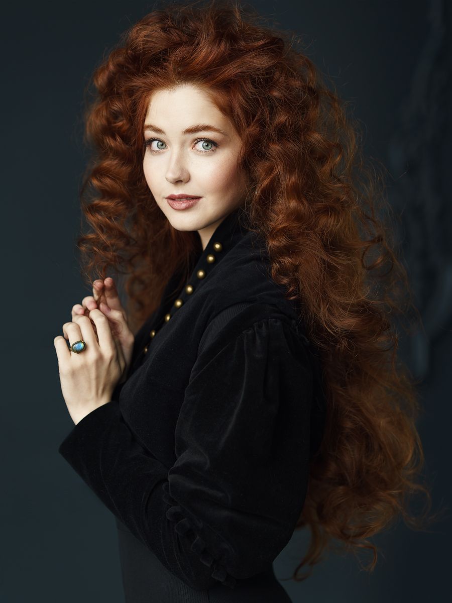 Портрет женщины с густыми вьющимися рыжими волосами, запечатленный в мягком студийном свете. Она одета в черный бархатный наряд с пуговицами, руки сложены перед грудью. Взгляд направлен в сторону, создавая ощущение задумчивости. Фотография передает глубину и текстуру — от блеска волос до фактуры ткани. Сдержанная цветовая гамма подчеркивает естественную выразительность модели. Работа Алексея Казанцева демонстрирует мастерство портретной съемки в классическом стиле.