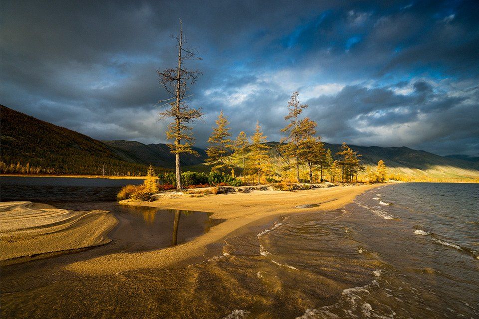 колыма, озеро джека лондона, река пурга, магаданская область, россия, озеро, утро, рассвет, лиственницы, волны, ветер, песок, берег, Алексей Харитонов