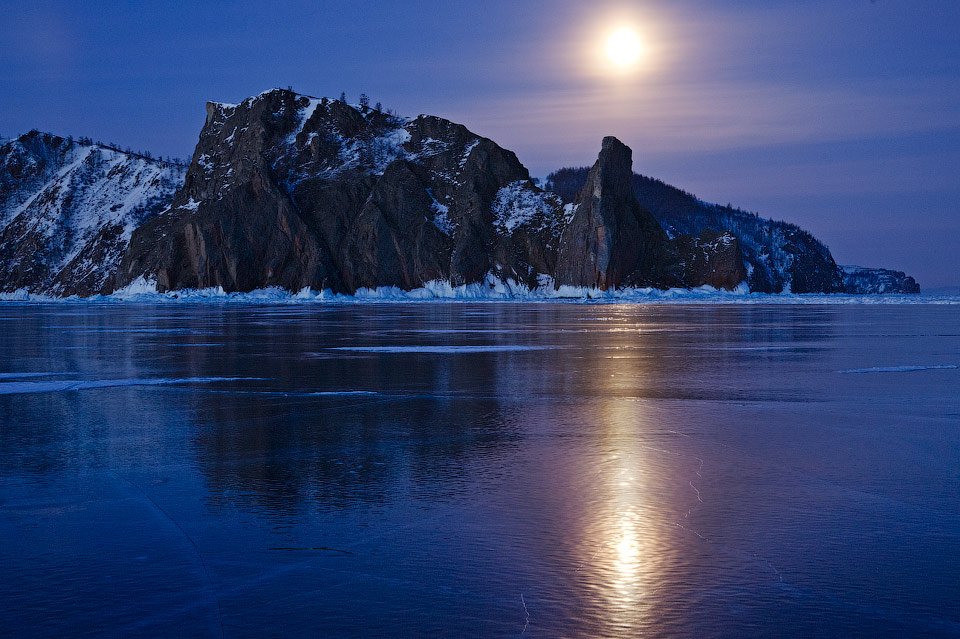Интереснее,на мой взгляд,тем что общий вид Байкала с Хобоем по центру(ну или пусть не по центру) с луной в таком свете и состоянии природы,был бо по мне куда более интересный кадр! Здесь кстати,телевик на столько сжал перспективу,что обьём плохо ощущается.Слева какая-то незаконченность,а хочется заглянуть туда. Луна выгорела по светам и смотрится как "клякса" плюсь пересветы на льду от луны. При более широкоугольном виде,эти нюансы исключились бы отчасти. Опять же,всё ИМХО!. Кому-то нравится,так ради бога:)