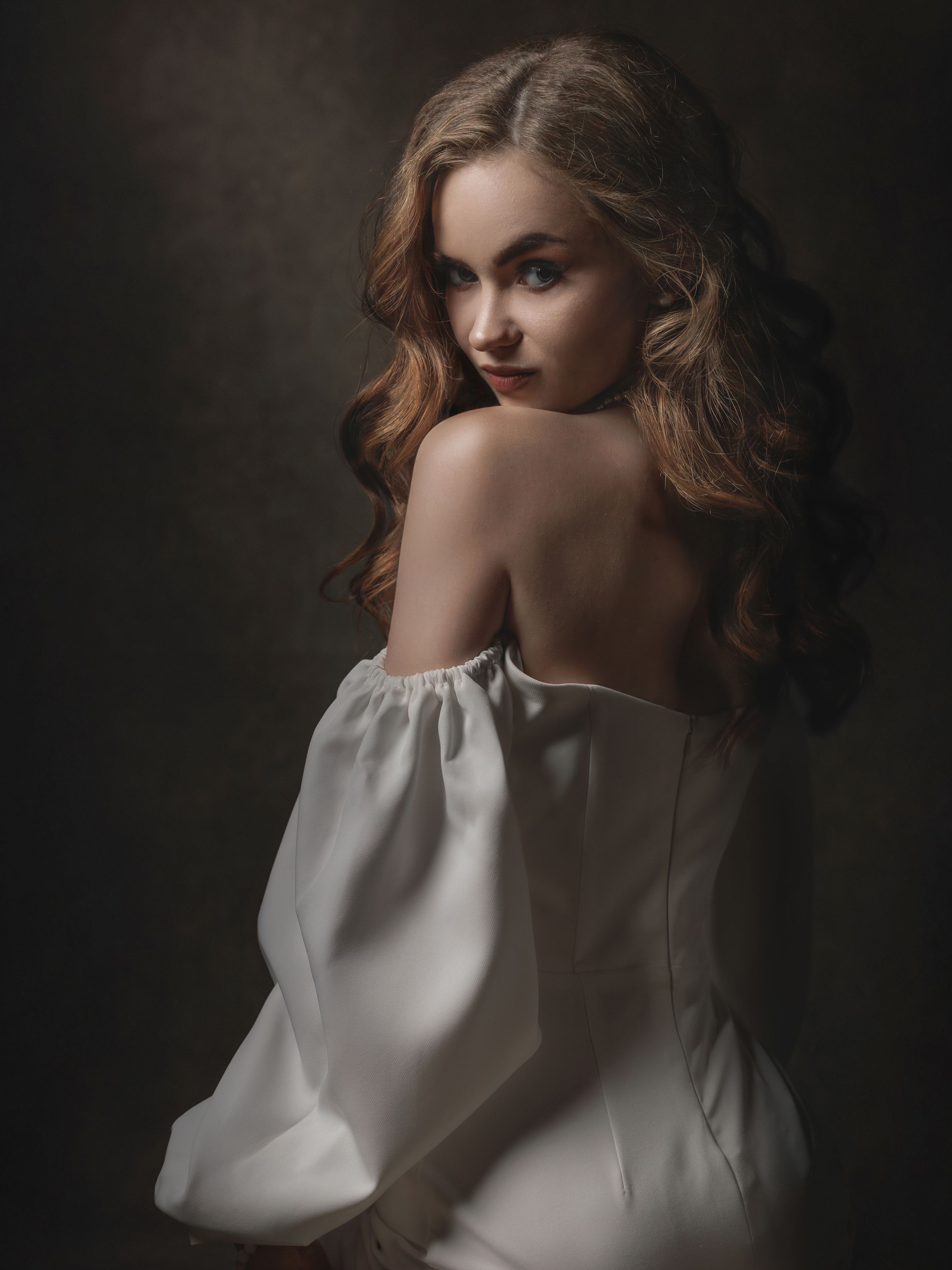 Алексей, снимок получился очень атмосферным. Свет ложится мягко, акцент на плечах и волосах — красиво. Девушка смотрит прямо, но с небольшой отстранённостью — это добавляет глубины. Фон тёмный, но не мрачный, хорошо подчёркивает фигуру. Хорошее чувство композиции.