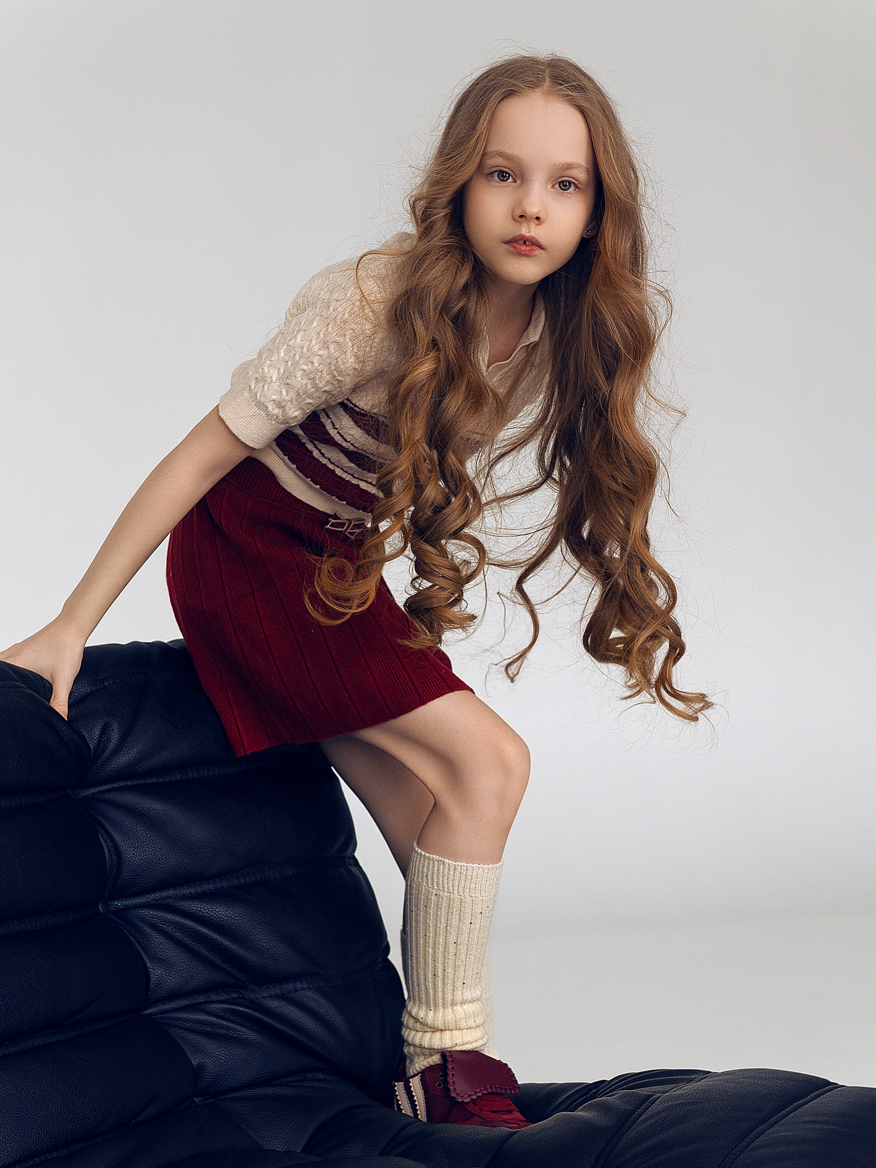 детскийпортреткрасиваядевочкадевочкавстудиикороткаяюбкаэмоцииребенка