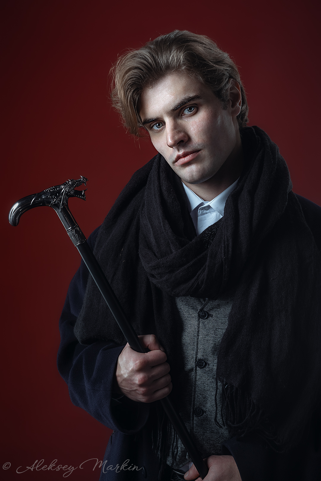 Мужской портрет, снятый на насыщенном красном фоне, передает ощущение глубины и интриги. Модель в темной одежде с посохом в руке выглядит как персонаж из классического романа — сдержанно, но с внутренним напряжением. Взгляд направлен прямо в камеру, вызывая интерес и задумчивость. Свет акцентирует черты лица и текстуру ткани, подчеркивая атмосферу драматизма. Фотография — пример удачного сочетания стиля, настроения и композиции.