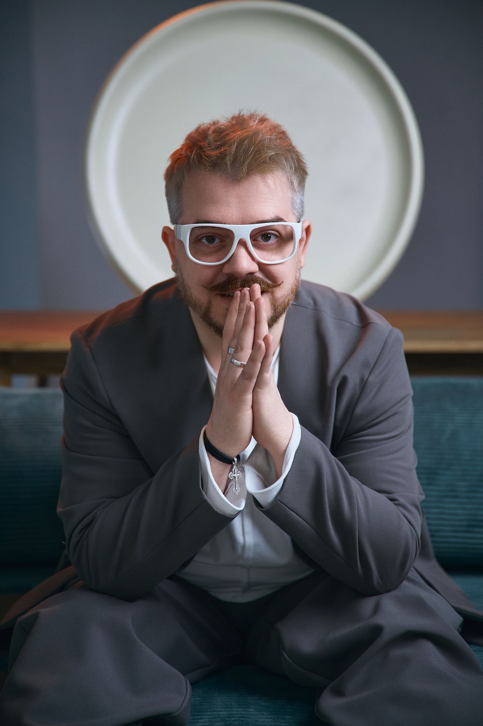 Вы сидите на синем диване, в сером костюме, с белыми очками — выразительный образ. Руки сложены перед лицом, взгляд прямой. На заднем плане — крупное круглое светлое пятно, возможно, декоративное панно.