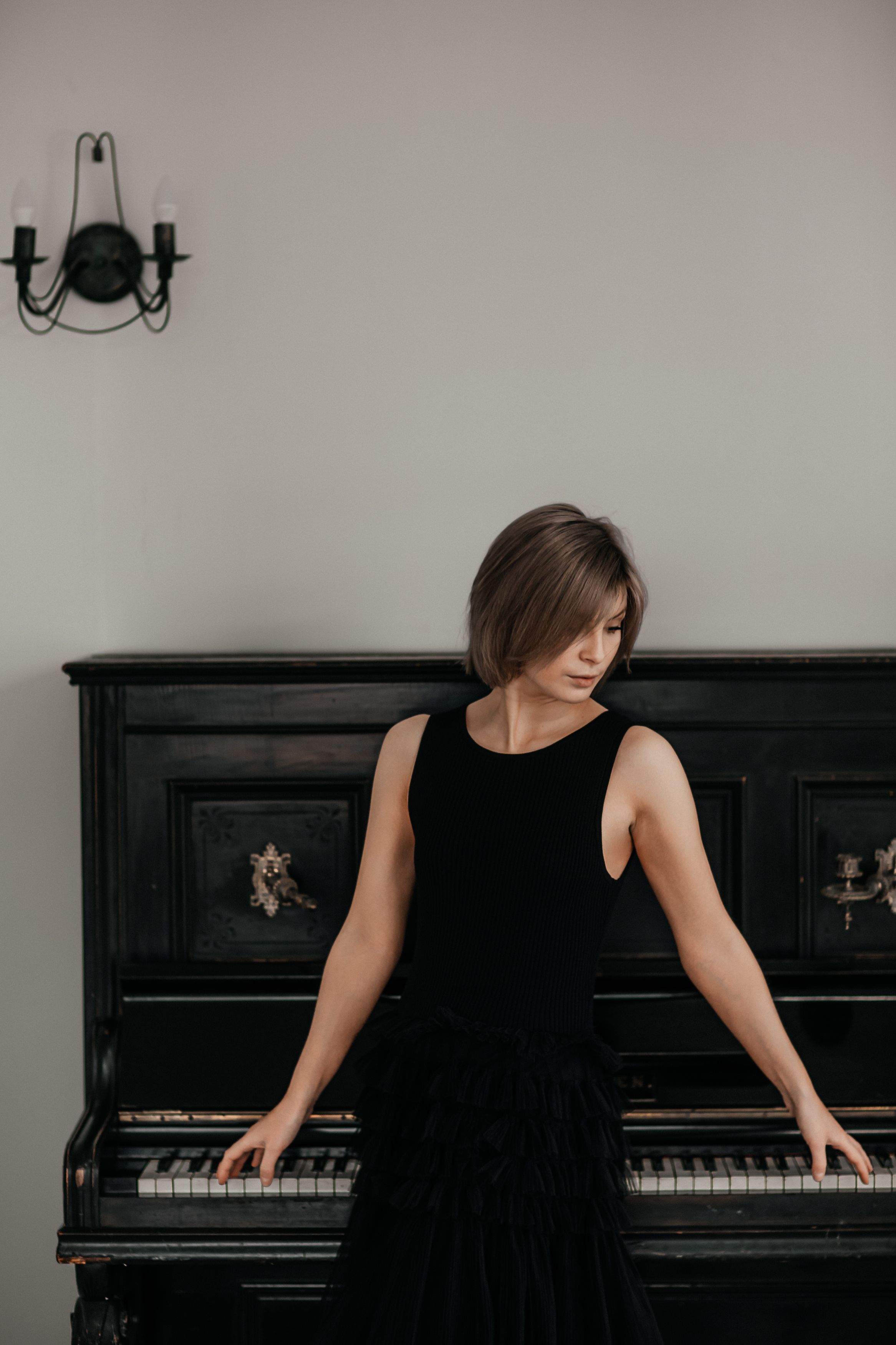 девушка, пианино, студия, черное платье, Алексей Плешков