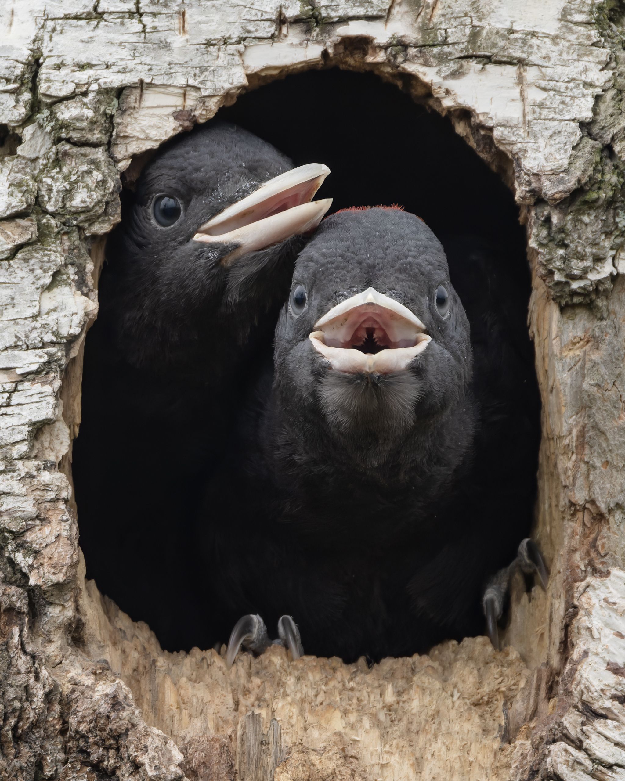 В дупле старой березы два птенца черного дятла, с черными пуховыми перьями и светлыми клювами, выглядывают наружу. Один из них широко раскрыл клюв — признак готовности к кормлению. Снимок запечатлел естественный момент в жизни редкой птицы, обитающей в лесах Европы и Сибири. Фотография передает атмосферу ожидания и уязвимости молодых птиц в их природной среде.