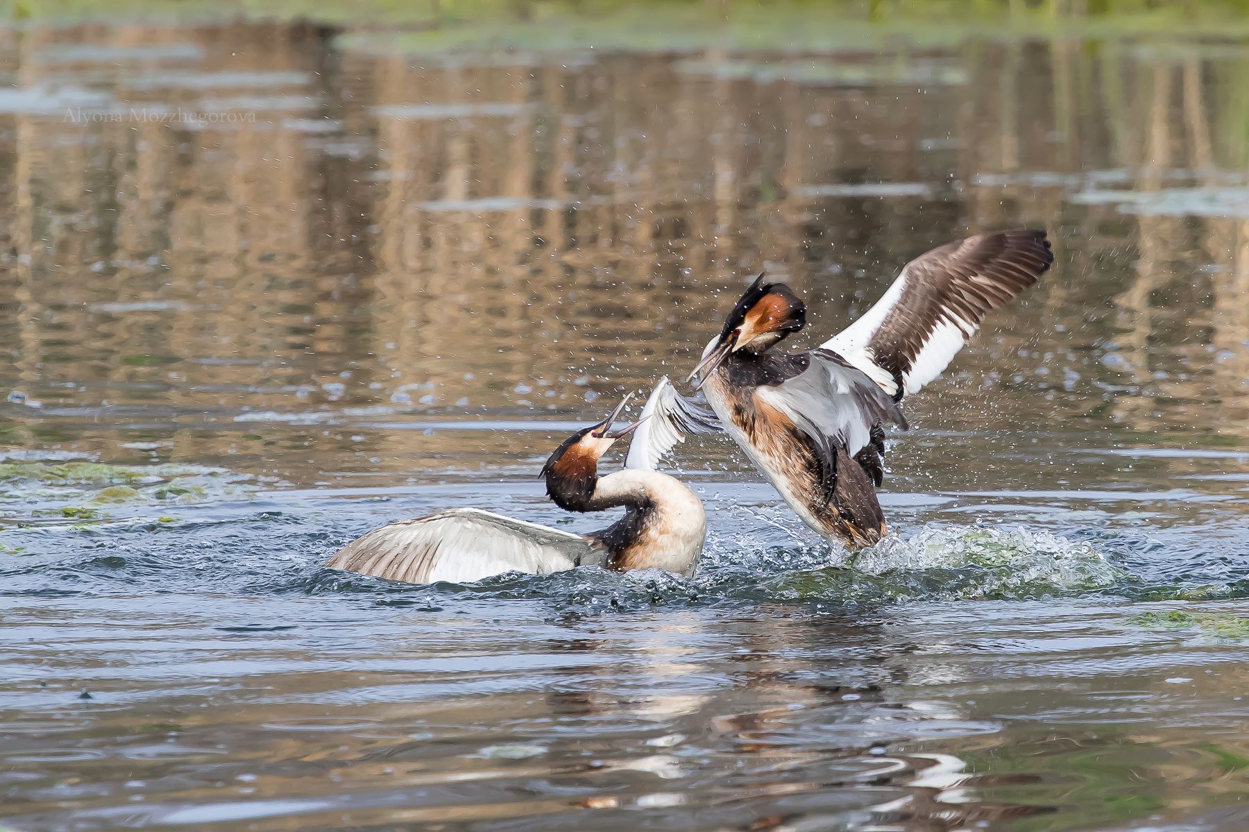 Очень давно хотела сфотографировать этих замечательных птиц... Этой весной мне это удалось. Чомга (большая поганка) - вид водоплавающих птиц из семейства поганковых размером чуть меньше утки. Обитает, как правило, в водоёмах со стоячей водой. Питается мелкой рыбёшкой, лягушками, насекомыми. В брачный период на голове у них отрастают необычные хохолки. Самец красиво ухаживает за самкой, преподнося ей различные подарки. Танец новобрачных отличается своей красотой и импульсивностью. При этом самец не потерпит на своей территории нового ухажера - если таковой приплывет, будет очень жестокая драка. В процессе ухаживаний птицы строят плавучее гнёздо из тины, водных растений и палок, которое впоследствии самка не покидает вплоть до вылупления птенцов. Вряд ли, понаблюдав за этой птицей, она оставит вас равнодушным. Фотографы, да и просто люди, очень любят её за необычную внешность и интересное поведение.