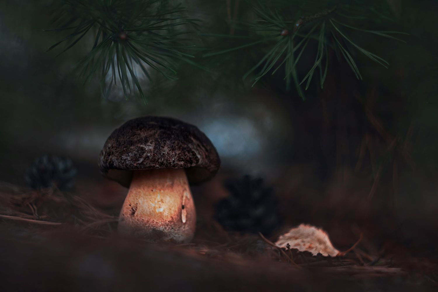 В глубине хвойного леса, где свет проникает редкими лучами, одинокий гриб возвышается над землёй, словно хранитель древних тайн. Его шляпка, покрытая мхом и пылью времени, контрастирует с тёплым оттенком ножки. Вокруг — тишина, нарушаемая лишь шелестом ветра в ветвях. Это не просто снимок — это момент, когда лес останавливается, чтобы вспомнить, кто в нём живёт. Фотография Алёны Сурниной передаёт атмосферу волшебства и умиротворения, свойственную осеннему лесу.