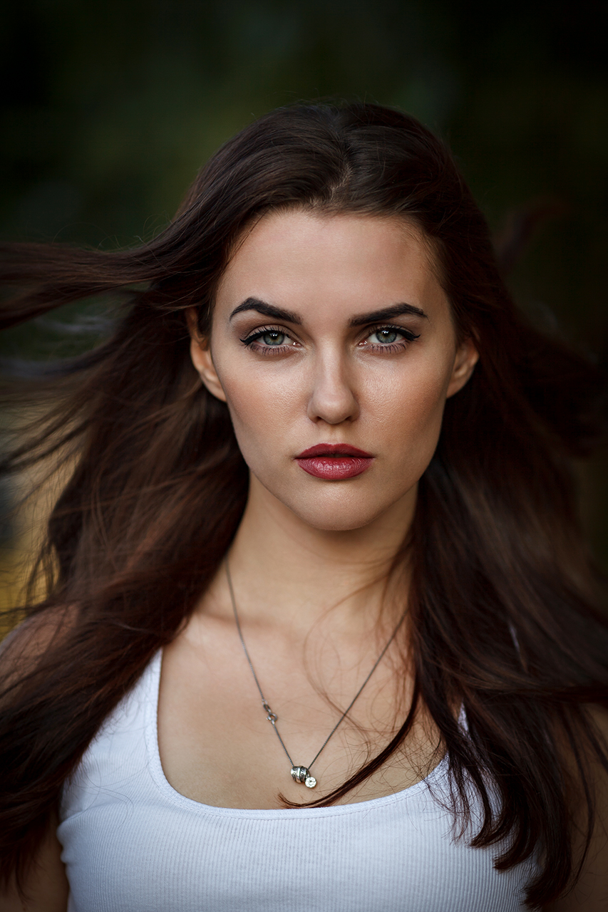 Strong eye contact, natural light, soft background. Hair movement adds dynamism. Skin texture looks clean, makeup is subtle but defined. Necklace detail is understated, complements the look. White top keeps focus on face. Overall, a clean, focused portrait with good exposure and depth.