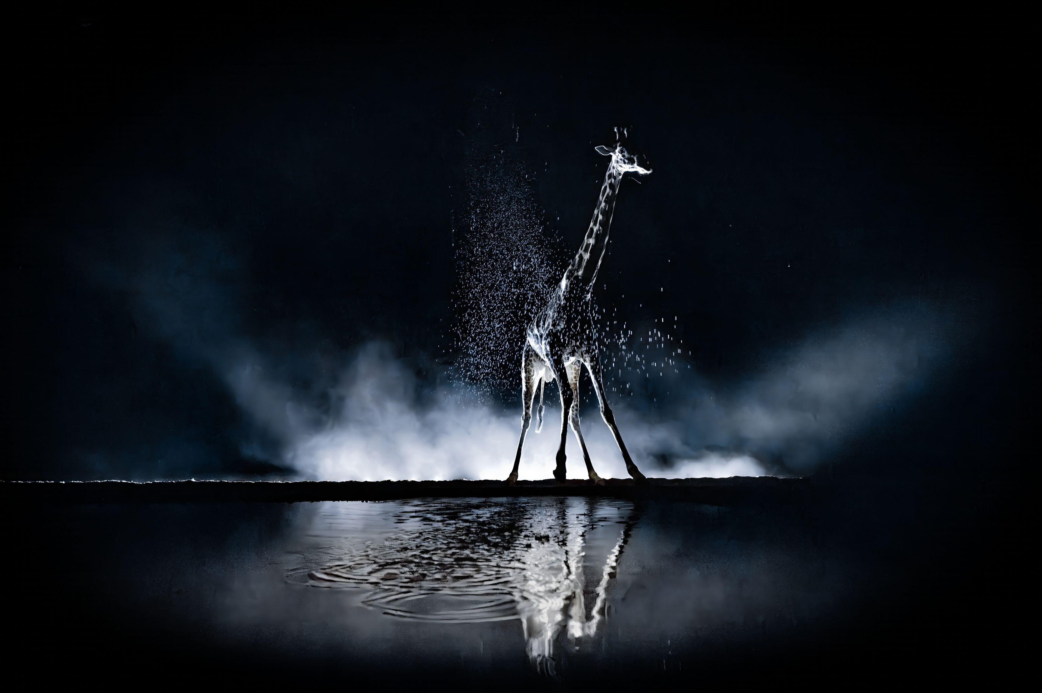 Фотография — сильная по композиции, с четким акцентом на силуэт жирафа и игру света с брызгами. Отражение в воде добавляет глубину, а дымка — атмосферу.