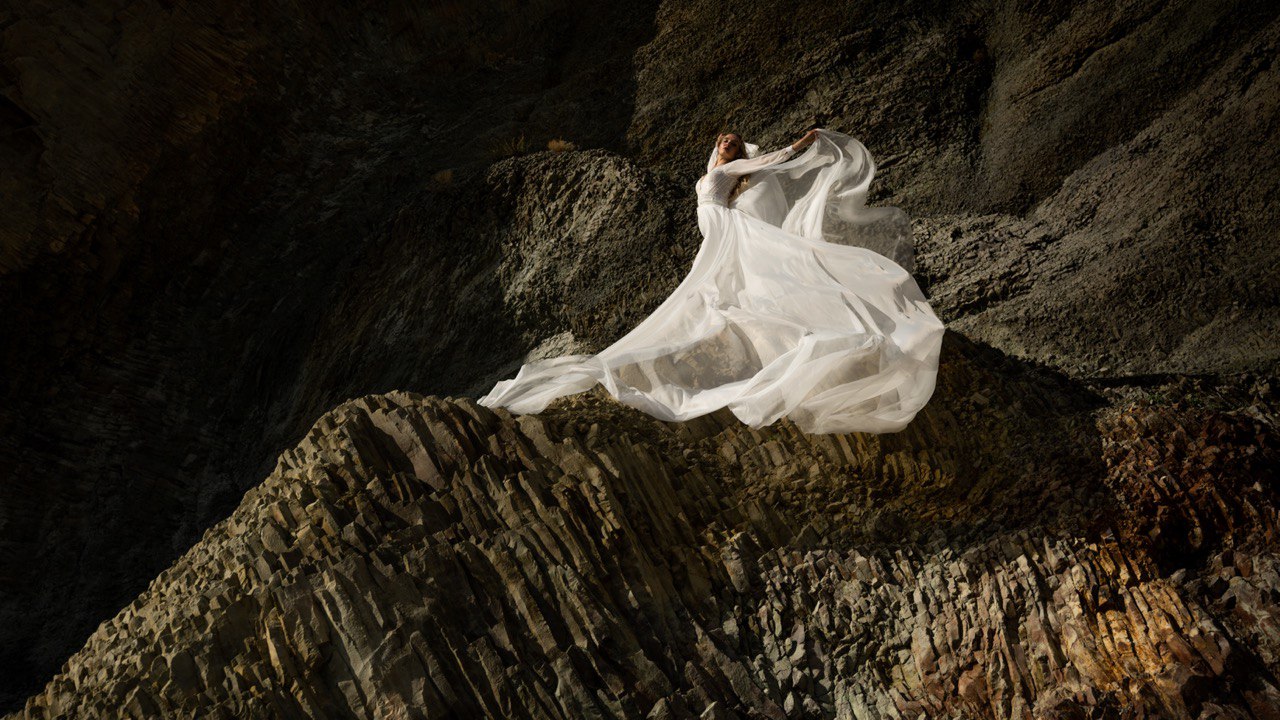 Вы мастерски передали драматизм ландшафта Крыма — Яшмовый пляж ожил благодаря контрасту тёмных скал и белоснежного, будто парящего, наряда. Движение ткани и игра света создают ощущение волшебства, словно фигура вырвалась из скал.