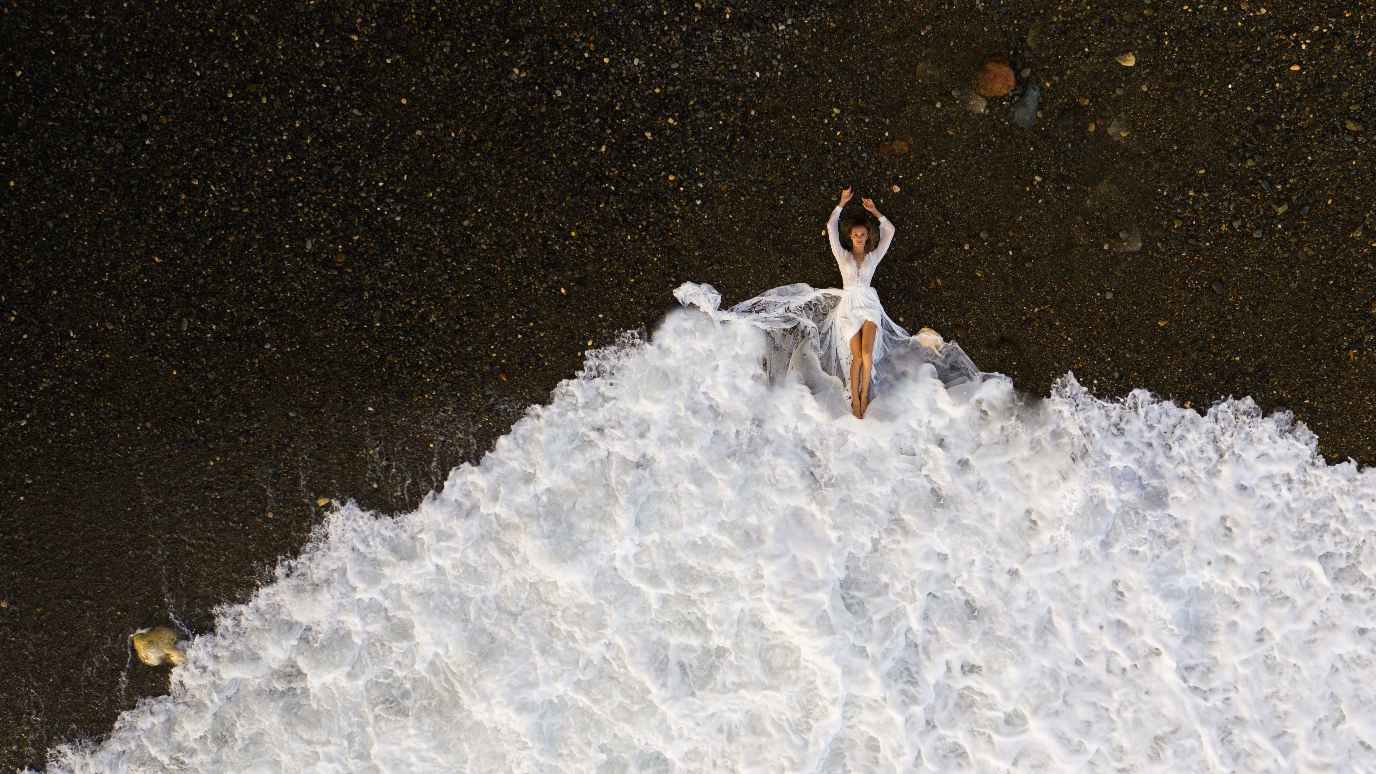 Вы уловили момент, когда волна остановилась — как будто время замерло. Белое платье, будто вырванное из морской пены, контрастирует с тёмным песком, и фигура кажется одновременно уязвимой и возвышенной.
