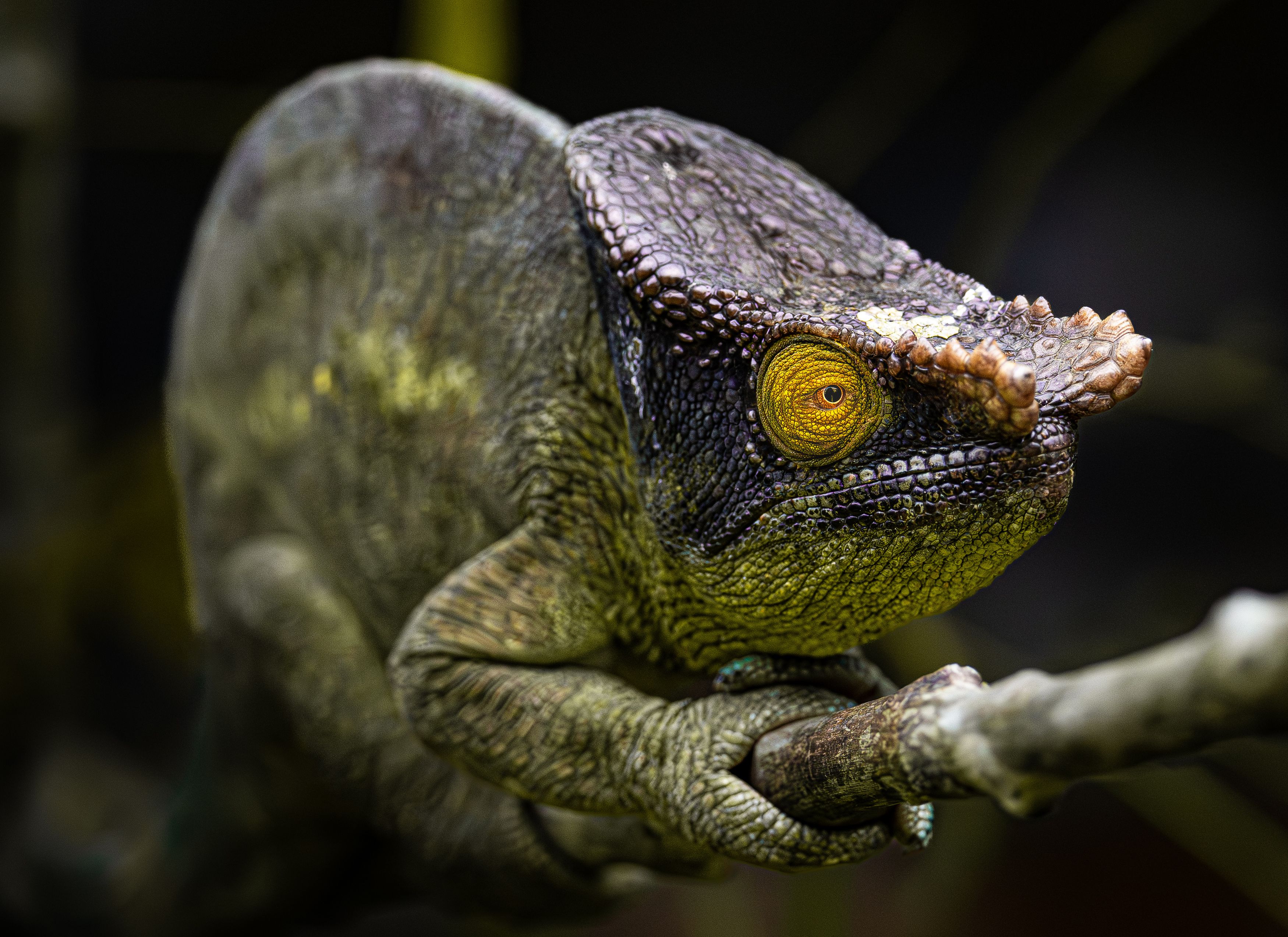 Хамелеон на ветке — выразительный и детальный кадр, где свет мягко подчёркивает текстуру кожи и глубину взгляда. 🐍