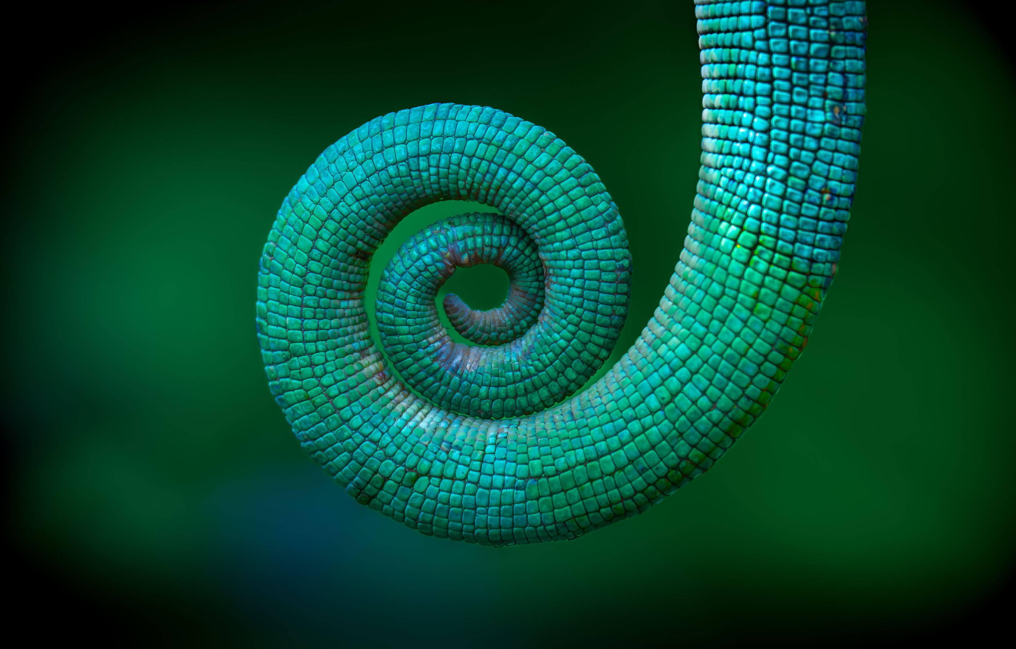 На фото - хвост хамелеона, закрученный в тугую спираль, как живой крючок, готовый в любой момент развернуться и обхватить ветку. Большинство видов используют такой цепкий хвост как пятую конечность: он обвивает опору, помогает удерживать вес тела, служит страховкой при перемещении по тонким веткам и даже компенсирует смещение центра тяжести, работая как природный балансир. В отличие от многих других ящериц, хвост хамелеона не отрастает заново, поэтому он бережно «бережёт» этот инструмент и почти никогда не рискует им зря.