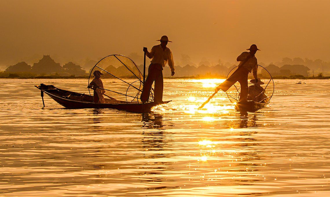 В Мьянме на озере Инле люди живут прямо на воде. Жители Инле называют себя "инта", что значит "сыновья озера". Они строят на забитых в дно сваях бамбуковые хижины с тростниковыми крышами и плавают на быстроходных лодках - сампанах. Первое, что поражает на Инле, - это необычный способ гребли, практикуемый местными жителями. Инта не сидят на веслах - они стоят на носу сампана и, обвив ногой весло, с удивительной ловкостью им орудуют. Такая "ножная гребля" удобна тем, что одна рука остается свободной и ею можно на ходу управляться с рыбацкими снастями. Ловля рыбы - одно из главных занятий инта. Главная снасть здесь высокая, обтянутая сеткой, конусообразная бамбуковая ловушка. Устроена она по принципу нашей верши. Только здесь ее не кладут, а ставят на дно. Рыба, оказавшаяся под такой вершей, входит в нее и назад уже выбраться не может. А шестом рыбак орудует для того, чтобы она побыстрее двигалась и не зарывалась в ил.
