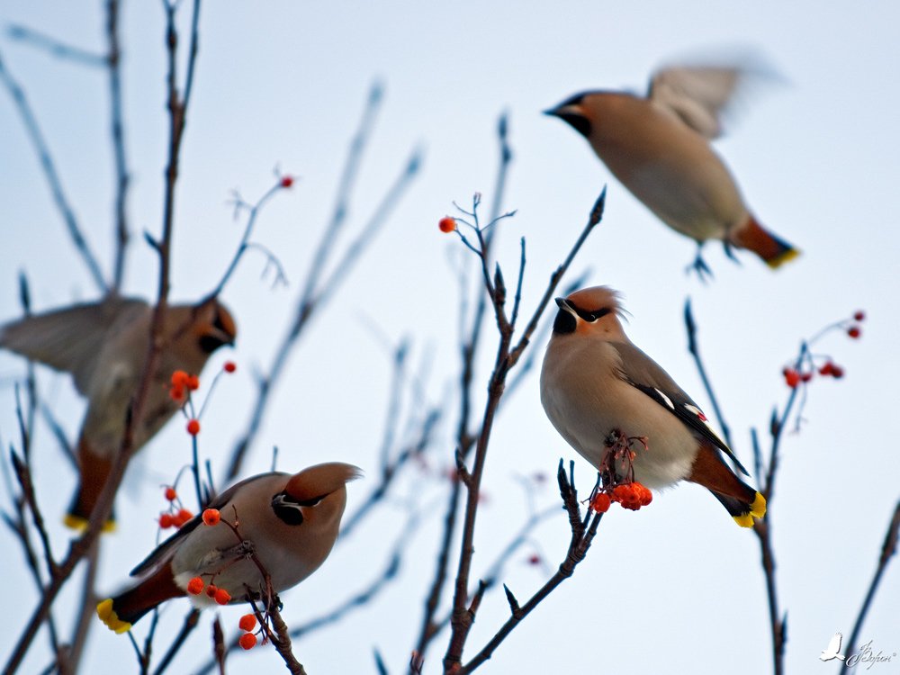 дикие, птицы, свиристель, рябина, зима, фотоохота, Ворон