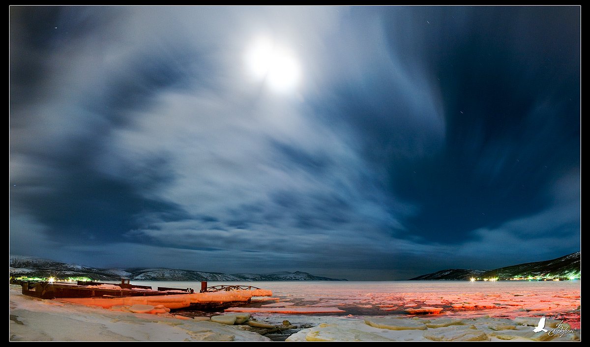 магадан, нагаево, нагаевская бухта, ночь, луна, небо, облака, охотское море, Ворон