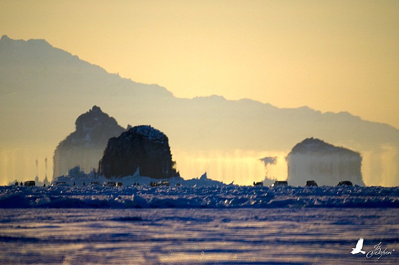 Снято с использованием объектива МТО-500. -25 градусов в Магадане много любителей подледного лова, и каждое утро рыбаки отправляются на ловлю корюшки, пахнущей свежими огурцами =), кто пешком идет, кто на машинах... Автомобили двигаются целыми караванами друг за другом, а по весне даже риск провалиться под лед, не останавливает заядлых рыбаков...