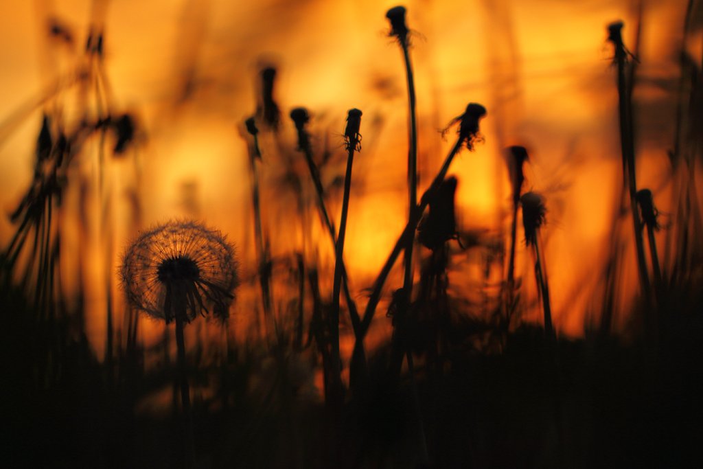 Одуванчики, сфотографированные на закате. Солнце уже приближалось к горизонту, и небо окрасилось в оранжевый цвет.