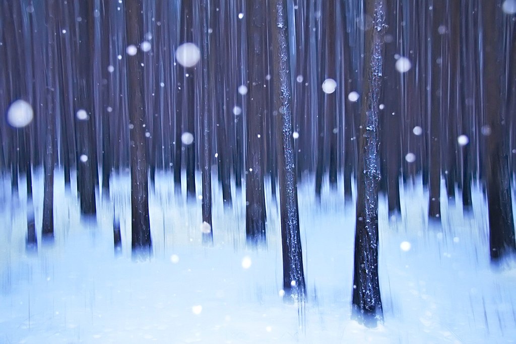 Фотография сделана вечером в сосновом лесу. Я установил длинную выдержку и в процессе съемки провел камерой сверху вниз. В результате стволы деревьев получились «смазанными», как если бы это была не фотография, а живопись. А падающие снежинки я подсветил вспышкой.