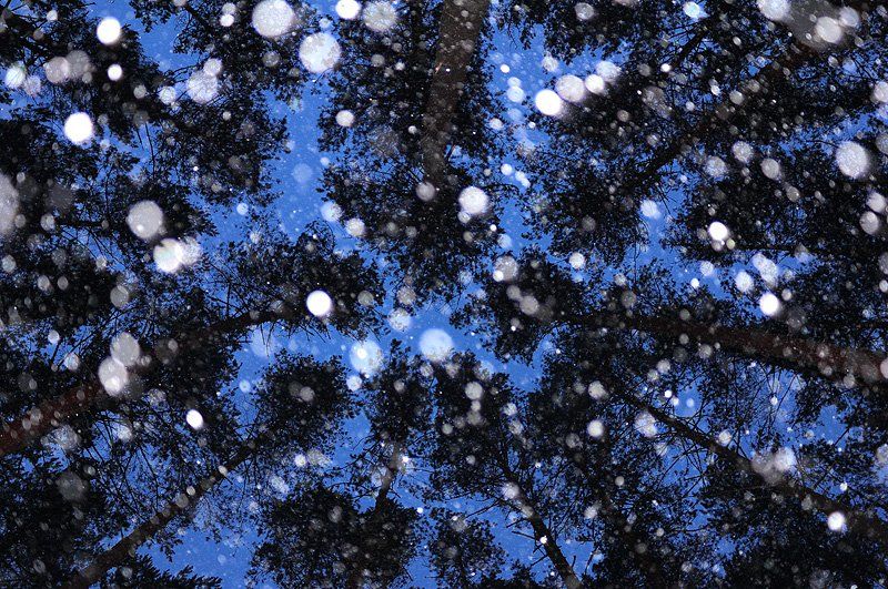 Сосны во время снегопада, сфотографированные от земли. Падающие снежинки подсвечены вспышкой.