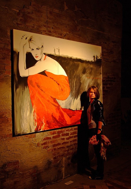 ... или "Под жопой у Ренаты". Меня всегда умиляло народное рвение увековечиться у "памятных мест". Много лет наблюдая в различных бытовых фотоальбомах карточки типа: "Я и пирамиды, Эйфелева, Эмпайр Стейт, Пизанская, Нотр Дам де...." всегда хотелось как-то отреагировать, стебануться... Воспитание, естественно, не позволяло озвучивать... Но вот позавчера, в "Ночь пожирателей музеев", на Винзаводе, я увидел сведшую меня с ума от умиления картинку. Практически каждая вторая девушка (отстояв небольшую очередь подобных) кокетливо позировала перед картинкой обожаемой народной актрисы! И точку съёмки они выбирали, не сговариваясь. Разумеется, я не смог пройти мимо, отказав себе в удовольствии грязного папарацци... Да простит меня эта милая девушка и автор полотна! ;)