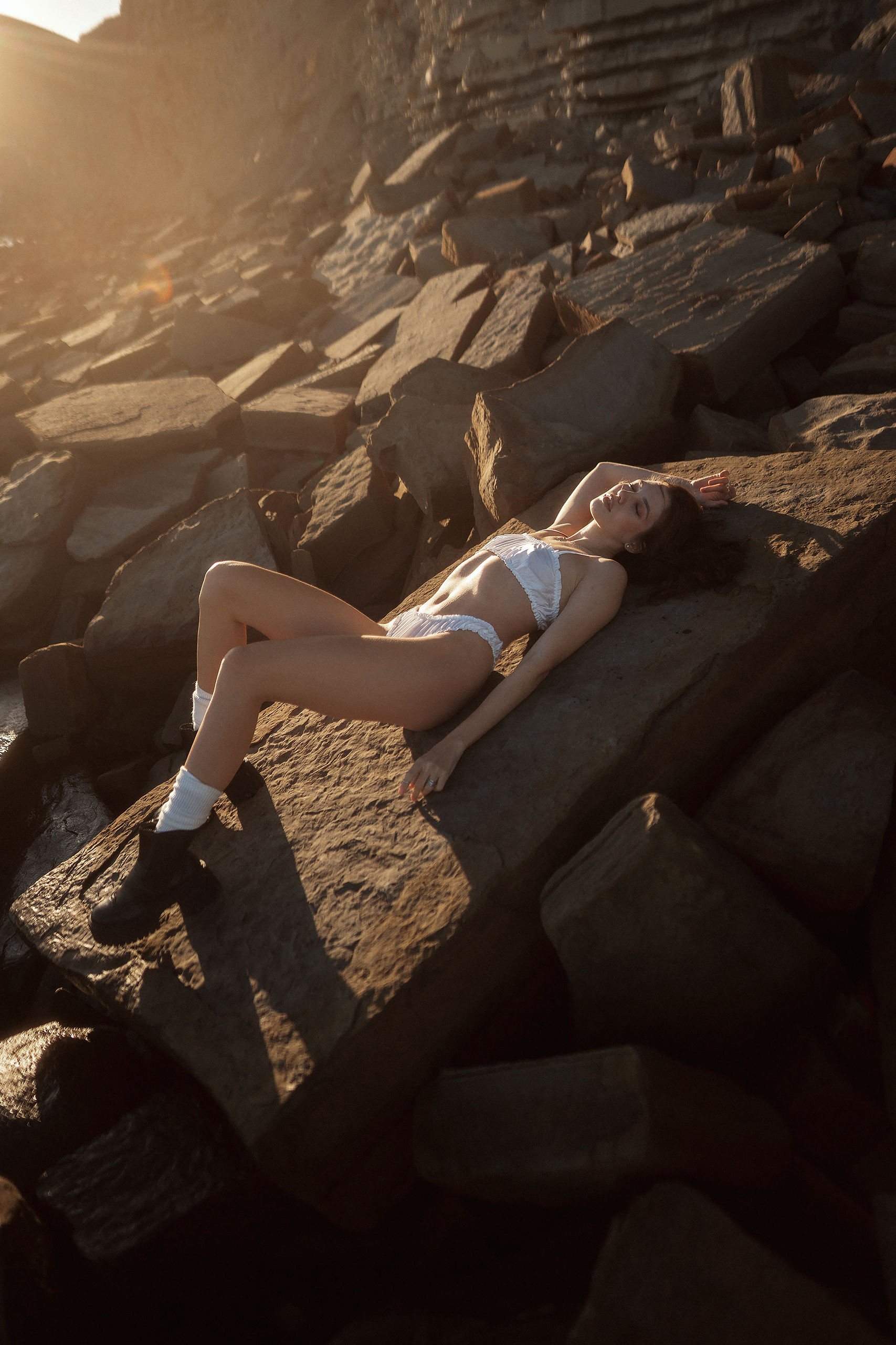Свет здесь — как всегда у Александра — работает на настроение: мягкий, золотистый, почти касающийся кожи, и модель лежит так, будто просто отдохнула на камнях, а не позирует.