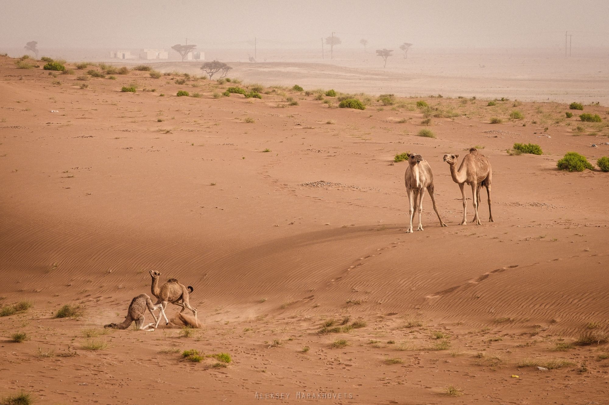 Маленькая драма разыгралась у нас на глазах в оманской пустыне Вахиба. Верблюжье семейство медленно перемещалось недалеко от места нашей стоянки. Два маленьких верблюжонка решили спуститься в неглубокую ложбинку. Но, видимо, немного не рассчитали скорость и свои силы. Первый верблюжонок не удержался на пока ещё слабеньких ножках и зарылся головой в песок, а бежавший за ним братик (или сестрёнка) со всего разбегу влетел в него.