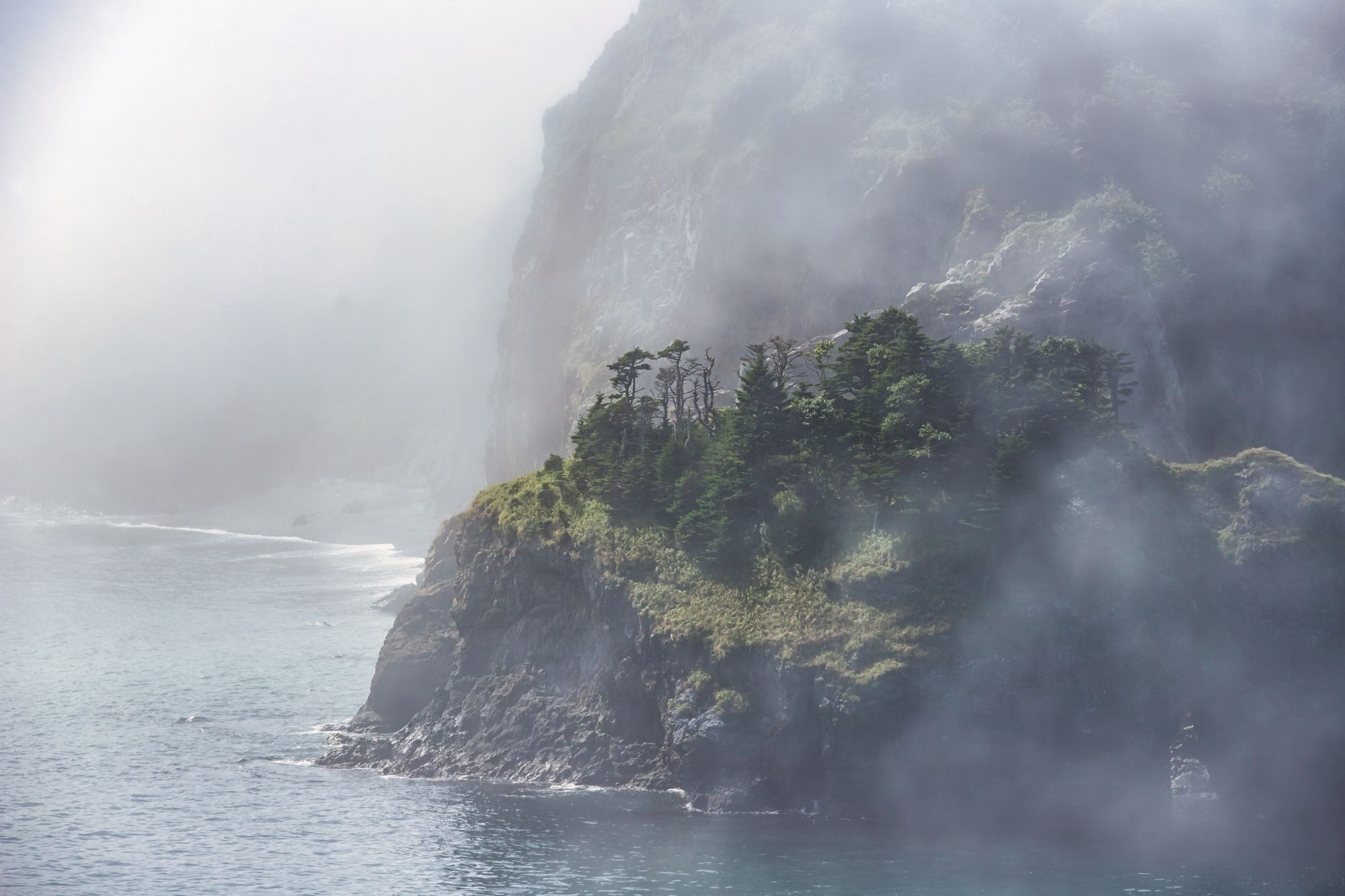 Скользящие туманы на восточном берегу острова Шикотан. Мы приехали в бухту Безымянная и ... поначалу не увидели абсолютно ничего — берег обрывался в белую мглу. Примерно через полчаса ветер начал раздувать густой туман, открывая взору по частям красивейшие шикотанские берега.