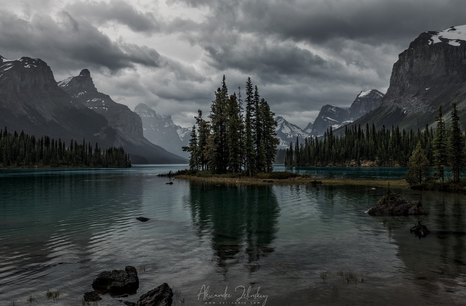 Озеро Малайн, национальный парк Джаспер, Канада. Очень известное место. Когда-то индейцы приходили сюда поклоняться своим богам. Таким мрачным, мне кажется, его еще никто не снимал.