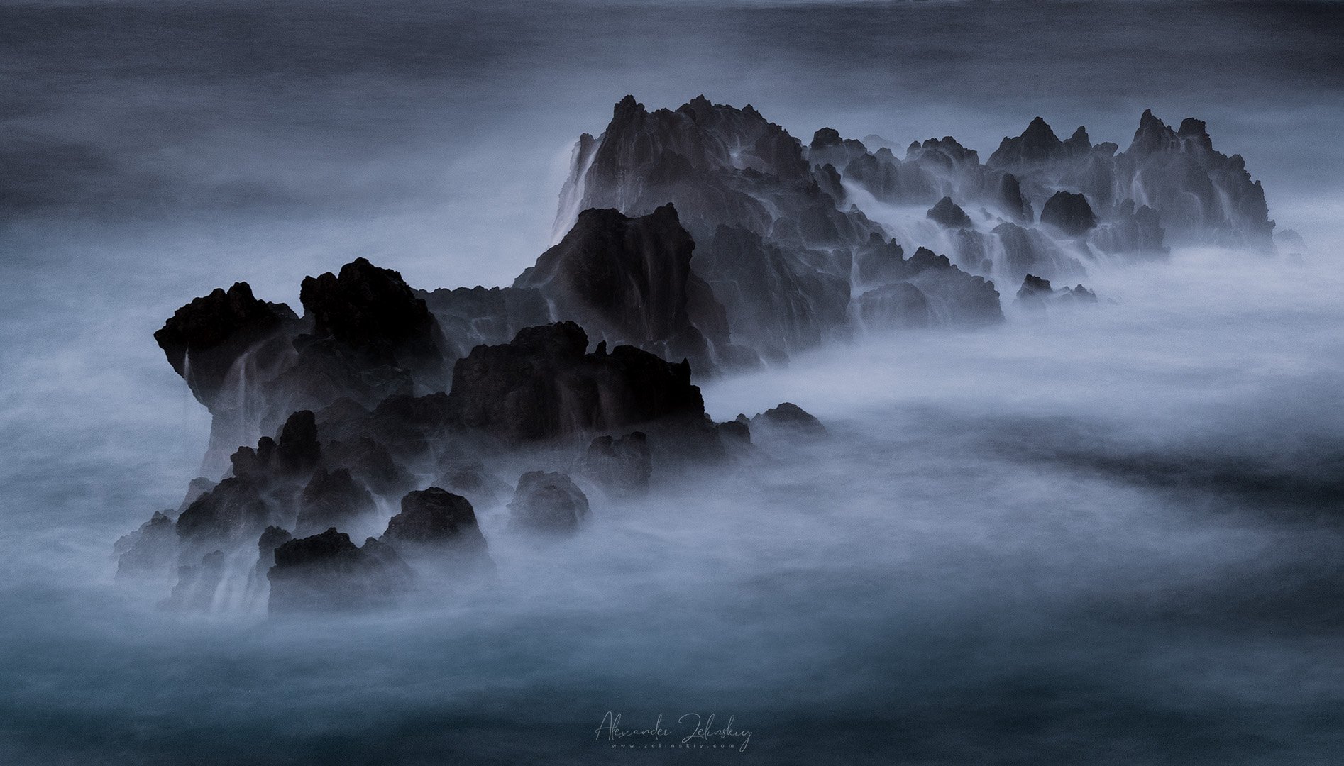 Мощные, но неспешные волны Атлантического океана подходят к берегам острова Мадейра, чтобы найти покой среди скал, защищающих побережье. Я хотел передать их замедленное движение длинной выдержкой. Остров Мадейра, Португалия