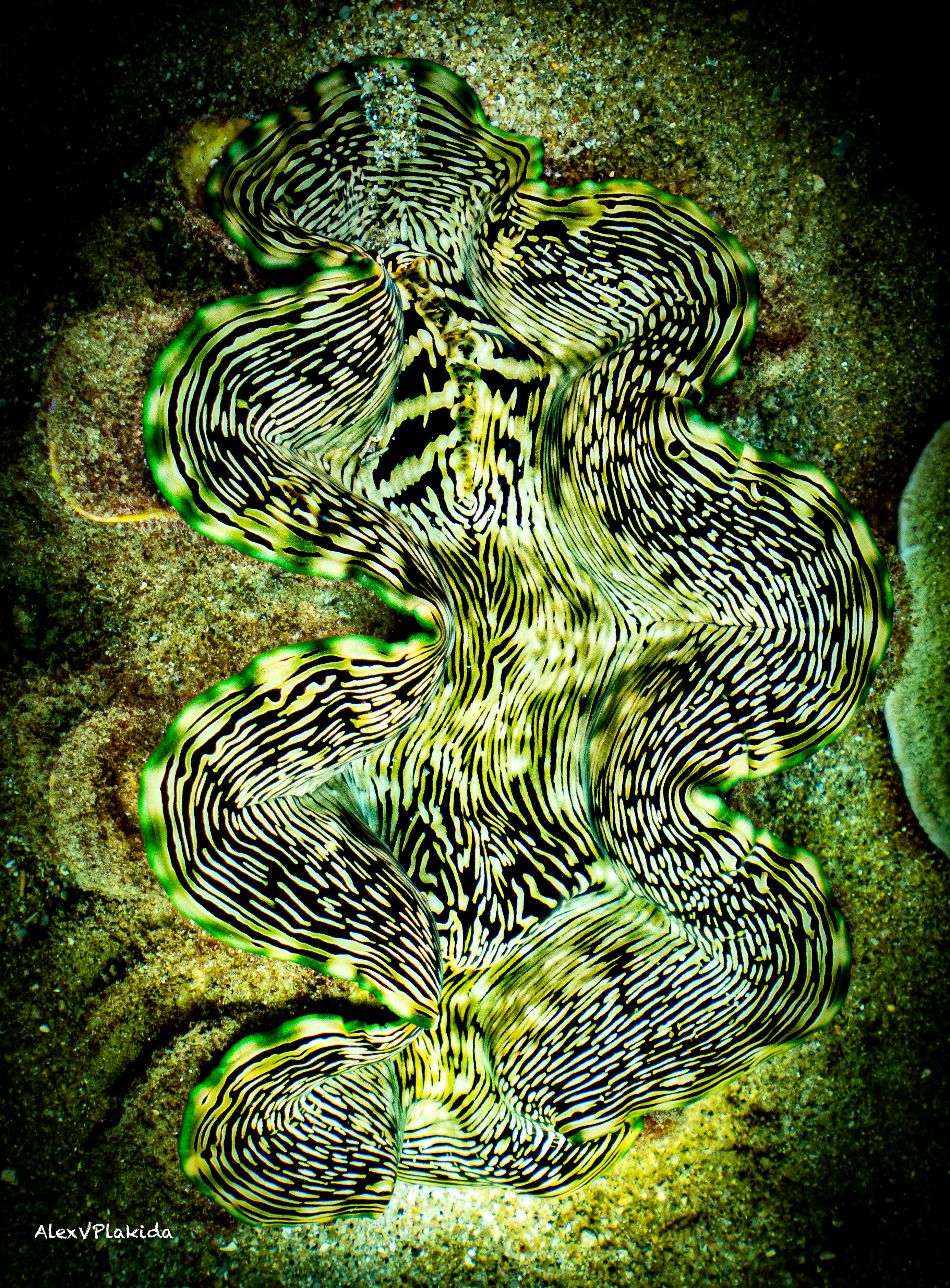 Эта тридакна точно любит и себя и мир вокруг: обычно тридакны закрывают створки при приближении. А эта - распахнула свои и дарит прекрасные волны зеленого!