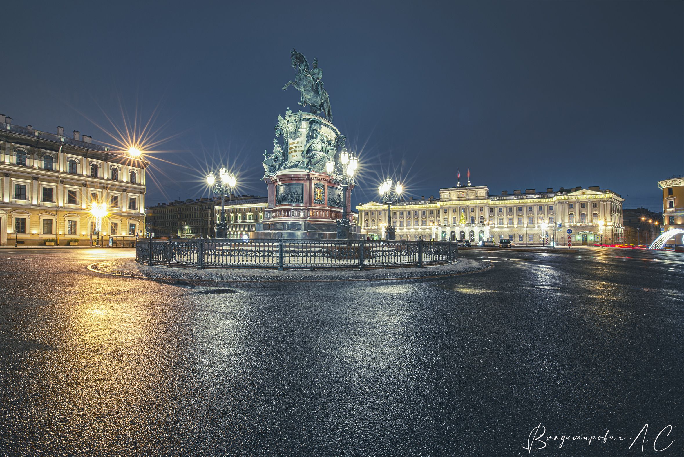 исаакиевская площадь питер ночь огни фонари памятник николаю, Алексей Смирнов