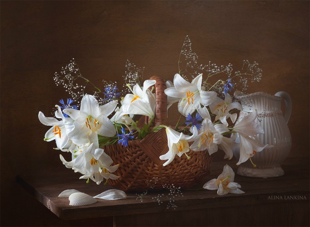 натюрморт, цветы, лилии, васильки, кувшин, корзина, лето, букет, алина ланкина, Alina Lankina
