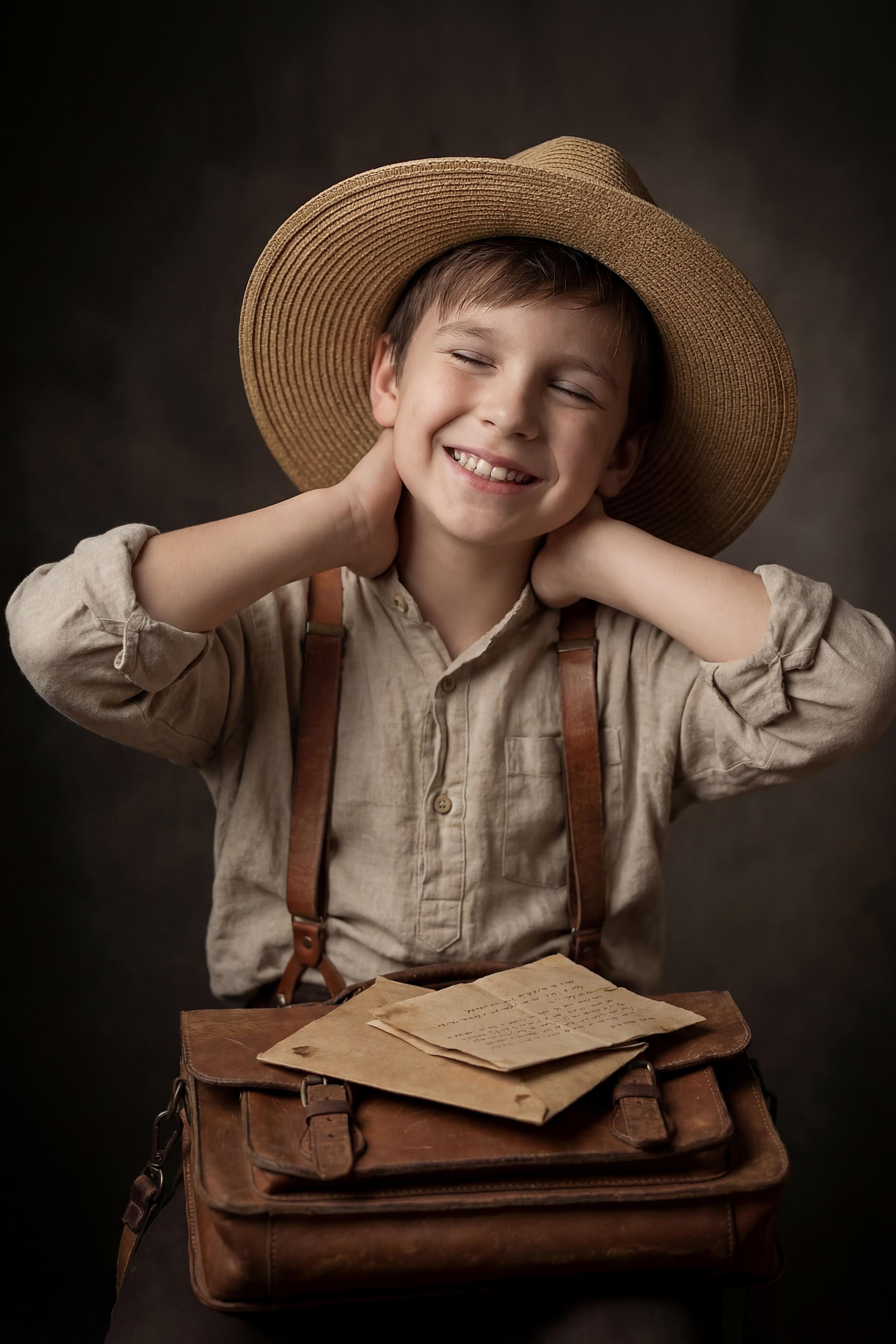 Татьяна, Вы передали тонкую гамму детских эмоций — от искреннего смеха до задумчивого внимания к старинному письму. Сдержанность и атмосфера эпохи в деталях — шляпа, саквояж, рукописный текст — создают глубокий, почти литературный образ.