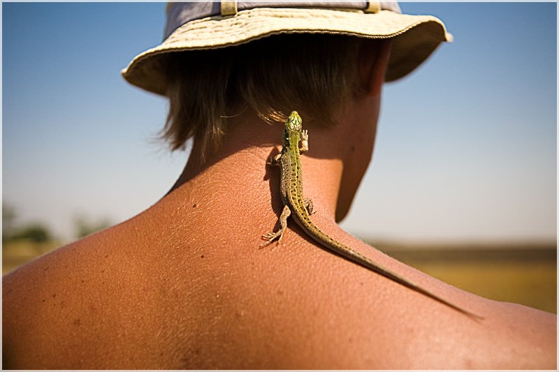 Вот она под "крышу" и пыталась залезть :-) Очаровательная была ящерка. Прибежала из степи, села ко мне в сумку, я подставил палец, она забралась по нему, ну а потом начала по плечам и рукам лазить :-)