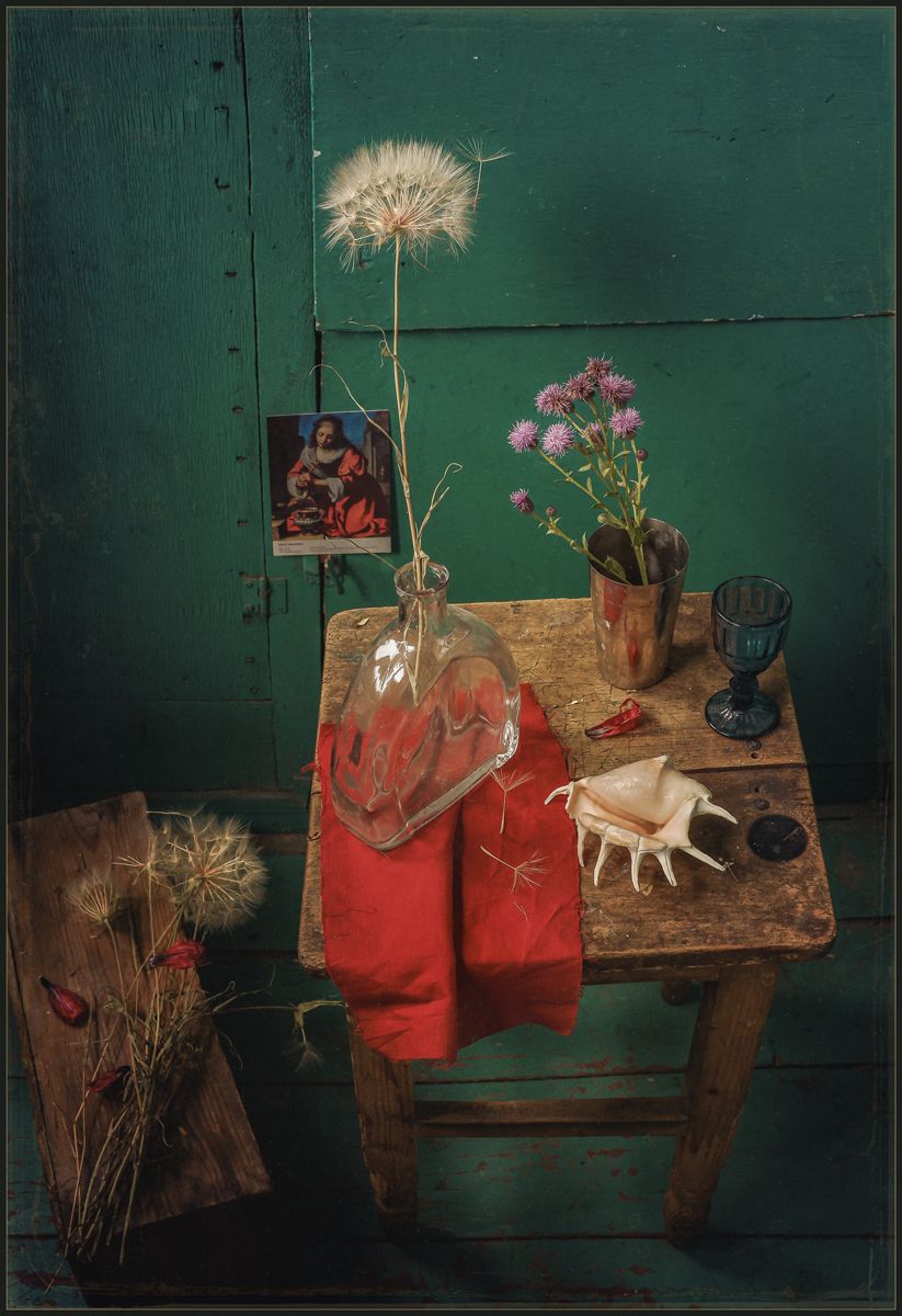 На снимке запечатлена тихая, почти молчаливая сцена — старый стол, уставленный предметами быта и природы. Стеклянная ваза с одуванчиком, красная ткань, керамический горшок с фиолетовыми цветами и небольшие аксессуары создают уравновешенную композицию. Зелёная стена в фоне придаёт сцене глубину и контраст. Фотография передаёт ощущение уюта, устаревшего времени и тонкой гармонии между искусством и природой. Снимок выдержан в спокойной, почти сдержанной манере, подчёркивающей текстуры и свет.