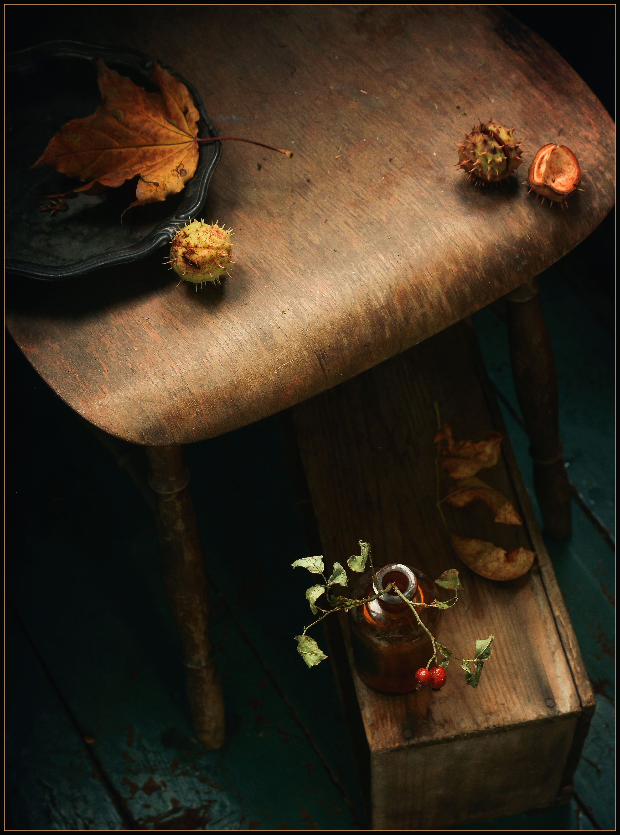 На старом деревянном стуле, потертом временем, размещён тихий осенний натюрморт: сухой кленовый лист в чёрной тарелке, несколько грибов и маленькая ваза с зелёной веточкой. Под стулом — деревянный ящик, в котором стоит бутылочка с жидкостью и плетёная корзинка. Тёплый, приглушённый свет подчёркивает текстуру дерева и создает атмосферу уюта и ностальгии. Фотография передаёт тонкую грусть и красоту увядания, свойственную осени. Работа Александра Хромеева.