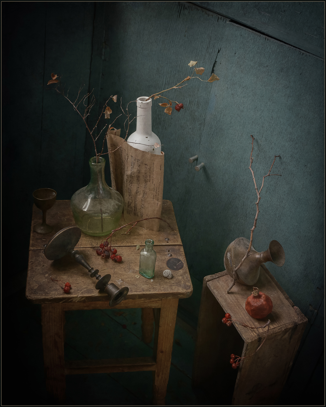 Состав, свет и детали — всё работает на настроение. Ветки, бутылки, старые бумаги — как будто застыл момент, когда что-то только что было написано или сказано.