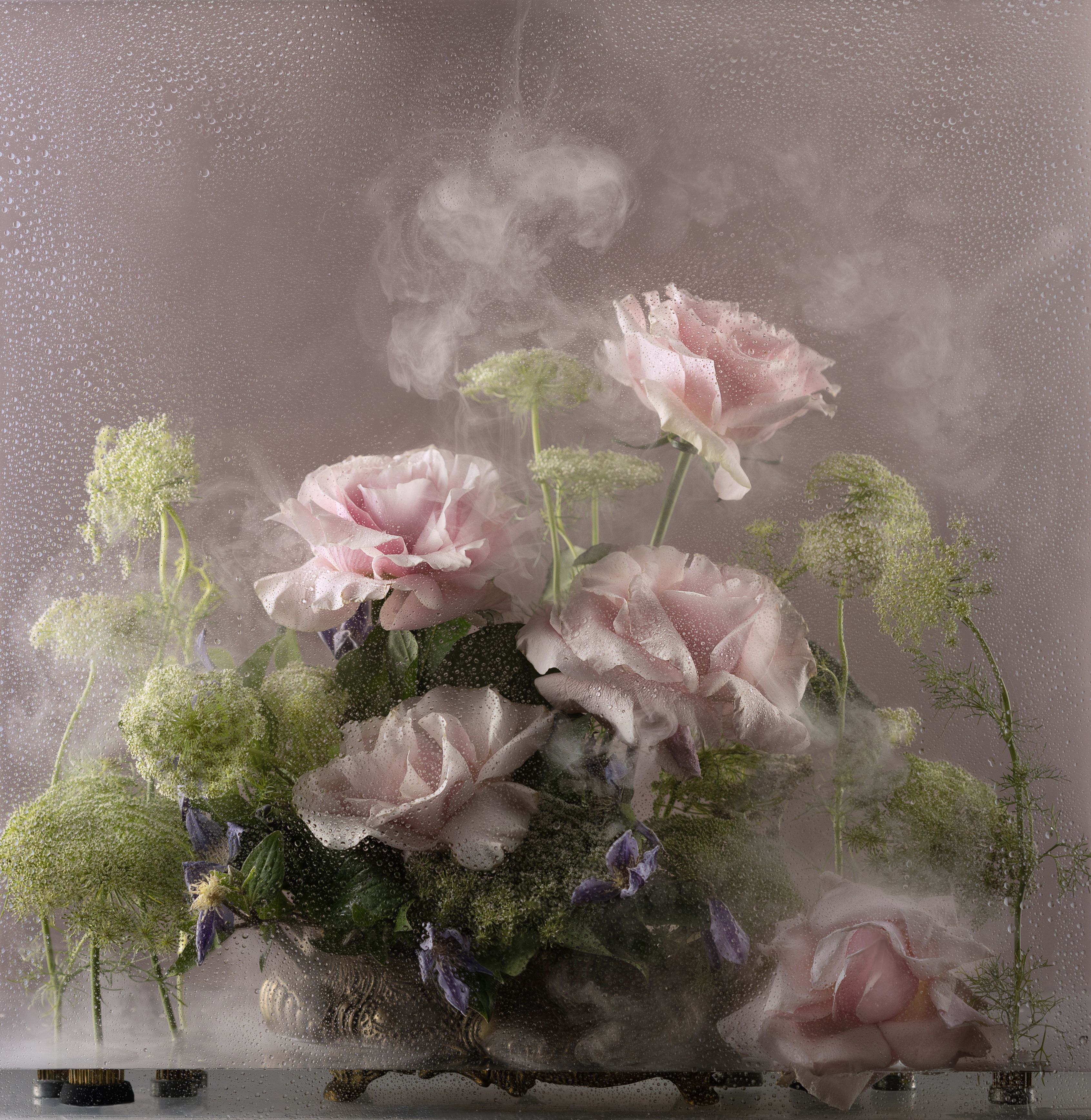 На снимке — натюрморт с розовыми розами и зелёными элементами, включая пушистые травы и фиолетовые акценты, в старинной вазе. Дым, окутывающий букет, придаёт сцене мистический оттенок, подчёркивая хрупкость и красоту цветов. Фотография, выполненная Kostomarova Alla, фиксирует момент, где реальность и фантазия переплетаются. Свет мягкий, фон матовый — всё это усиливает впечатление эфемерности и изысканности.
