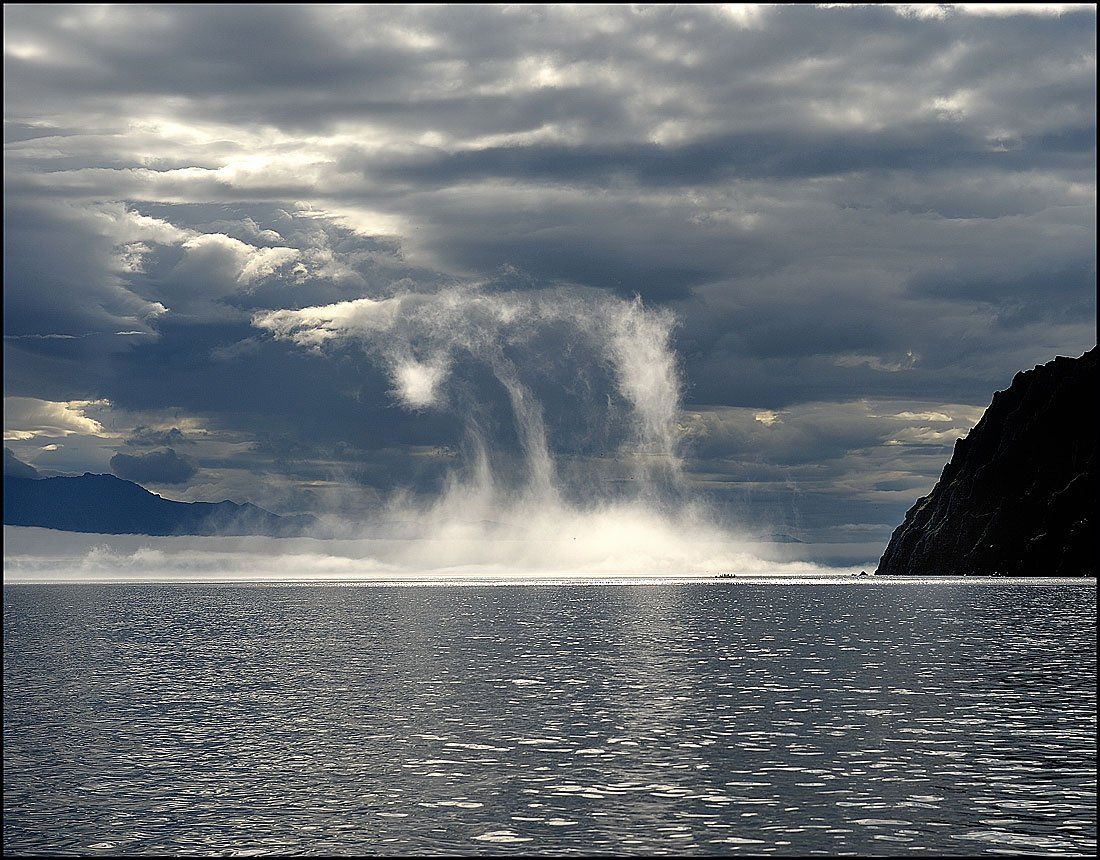 В каком смысле? Воздушный поток закрутил остатки утреннего тумана, на катере судя по всему ловят палтуса (мы сами через полчаса стали там рыбачить), справа остров Завъялова и открытое море, прямо по курсу п-ов Кони, слева в 60-ти км. г. Магадан и бухта Нагаева.