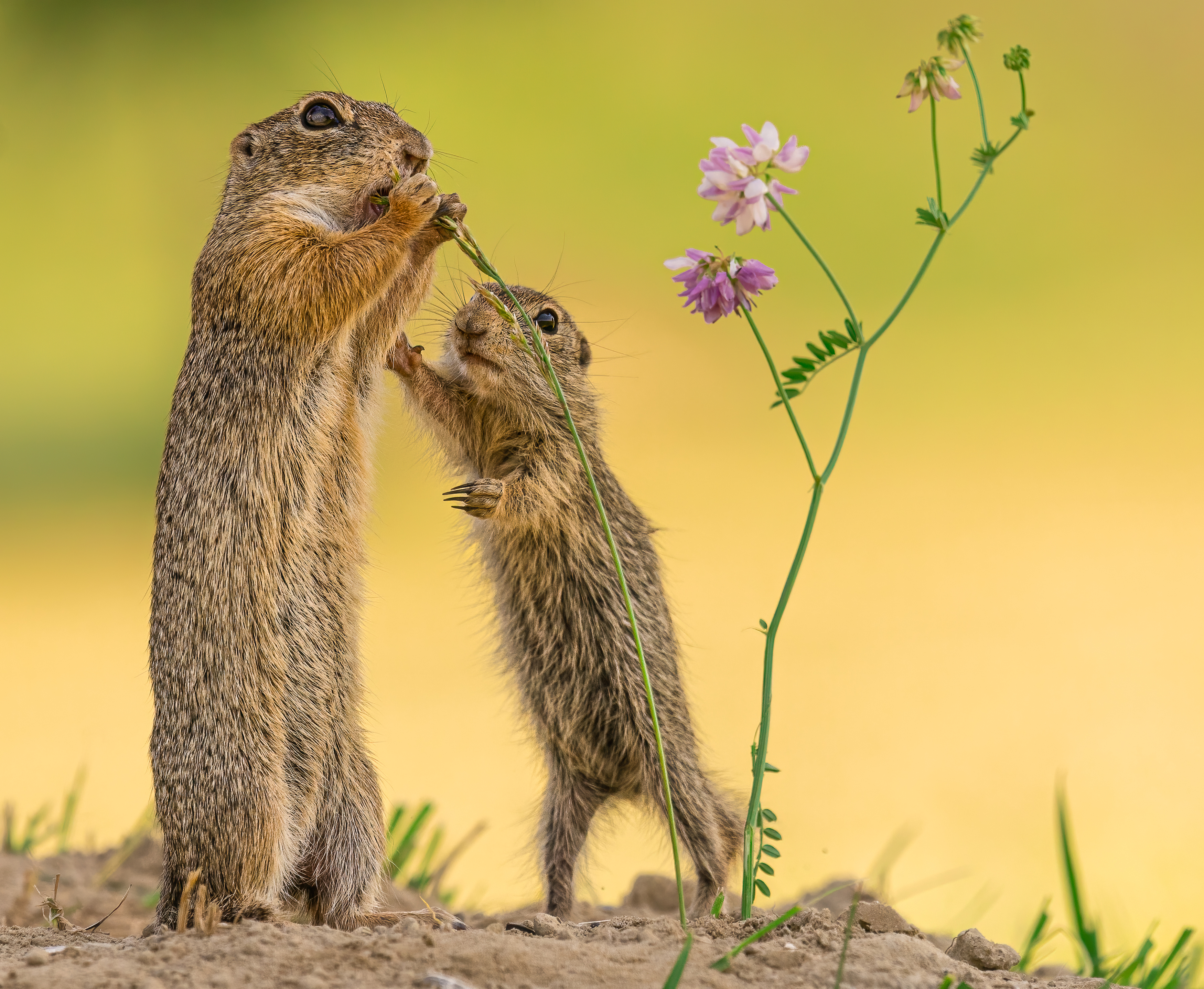 На фоне мягкой зелени и нежных цветов две фигурки сусликов создают сцену, наполненную нежностью и заботой. Взрослый суслик, словно мать, поддерживает малыша, помогая ему дотянуться до цветка. Это не просто кормление — это урок выживания, передаваемый с любовью. Фотография Тимеи Амбрус захватывает мгновение, когда природа раскрывается в самых трогательных формах — в заботе, обучении и связи поколений.
