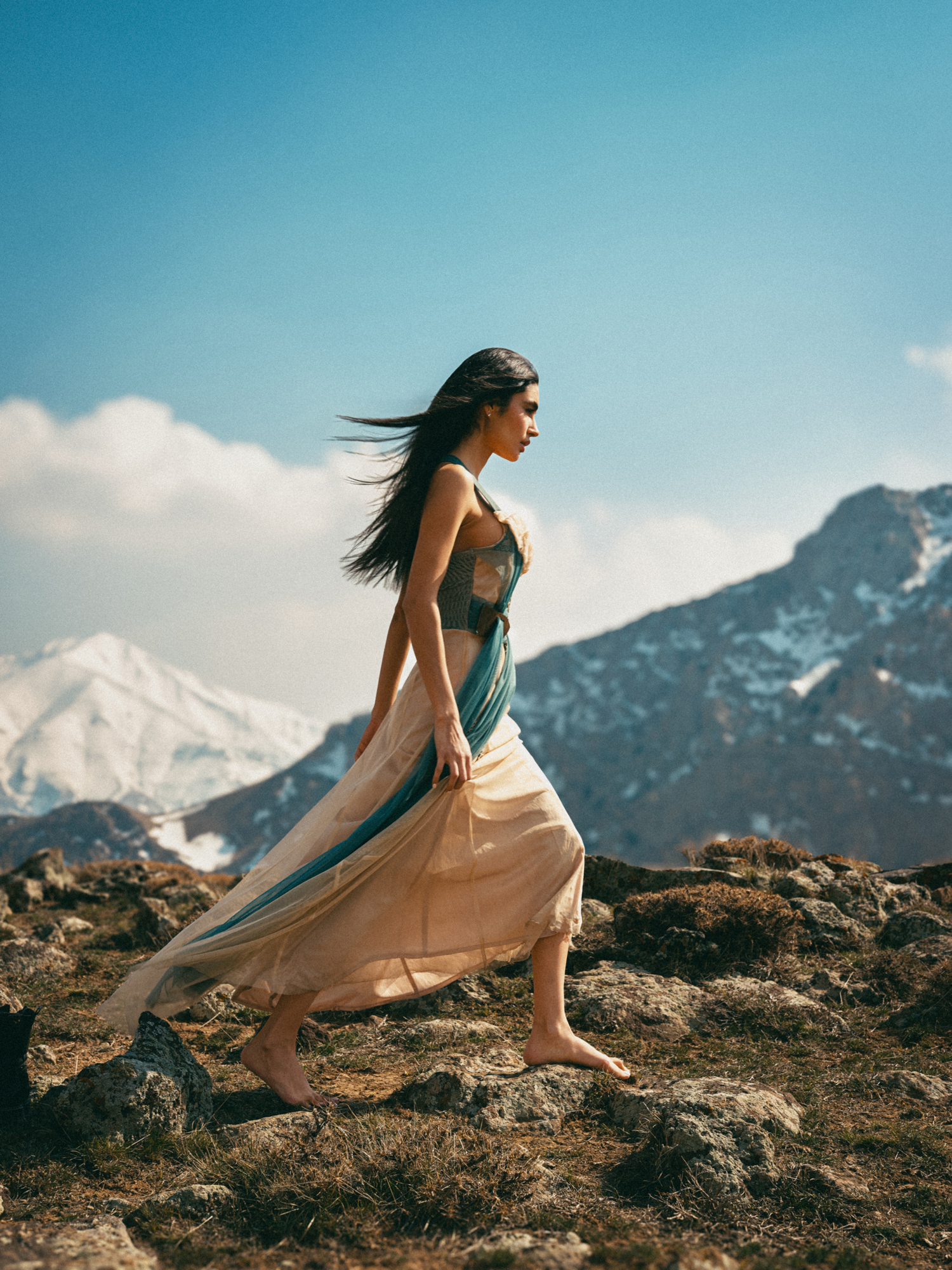 Woman in flowing dress walks barefoot on rocky terrain, wind lifts her hair and skirt. Snow-capped mountains under clear blue sky. Natural light, strong composition. 🌄✨