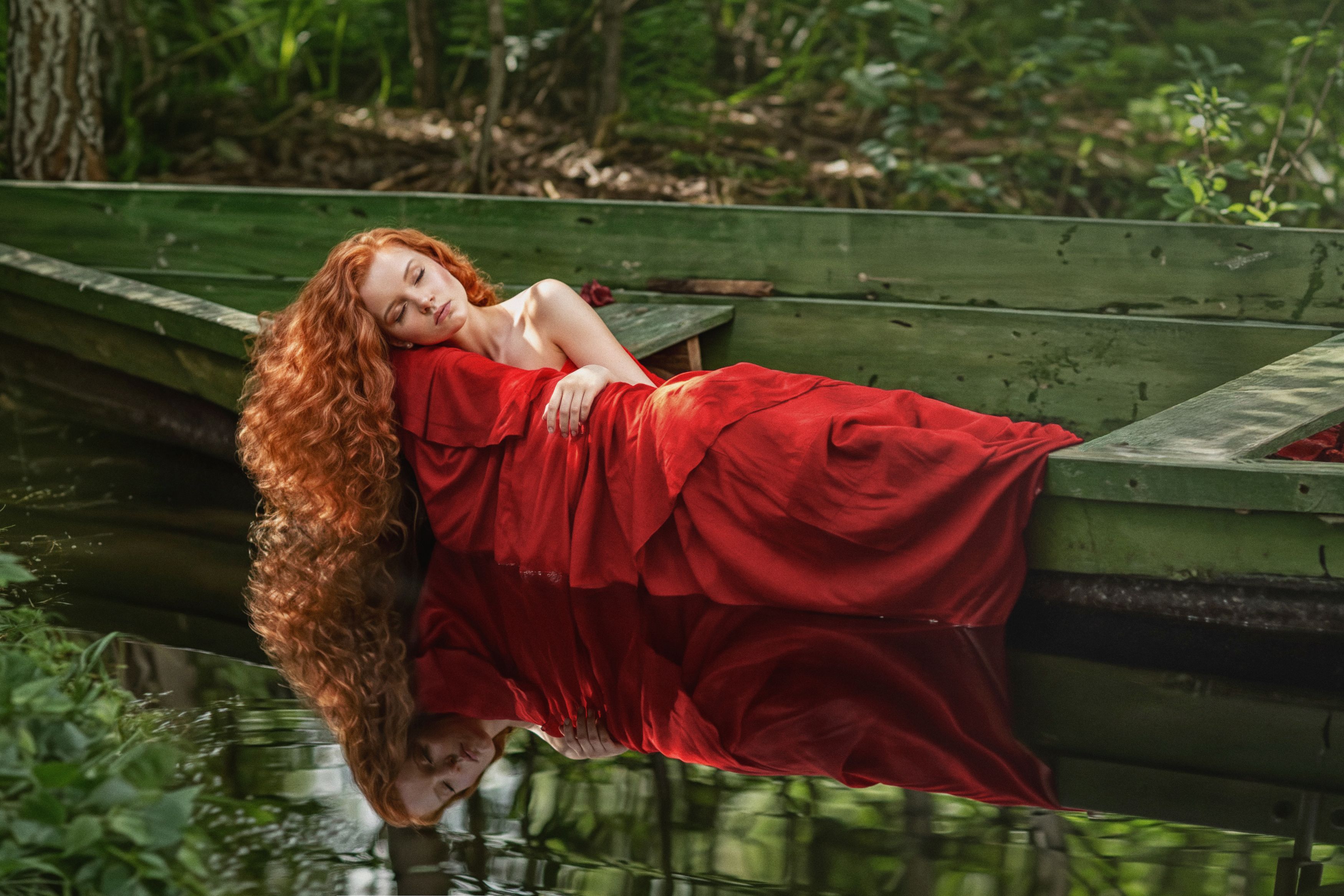 На снимке Анастасии Бармины — женщина с ярко-рыжими волосами в красном платье, лежащая в старой зелёной лодке, частично погружённой в воду. Её отражение в воде создаёт симметричный образ, усиливающий ощущение покоя и единения с природой. Сцена снята в лесу, где тишина и естественный свет подчёркивают эстетику момента. Фотография передаёт атмосферу мечтательности и гармонии.