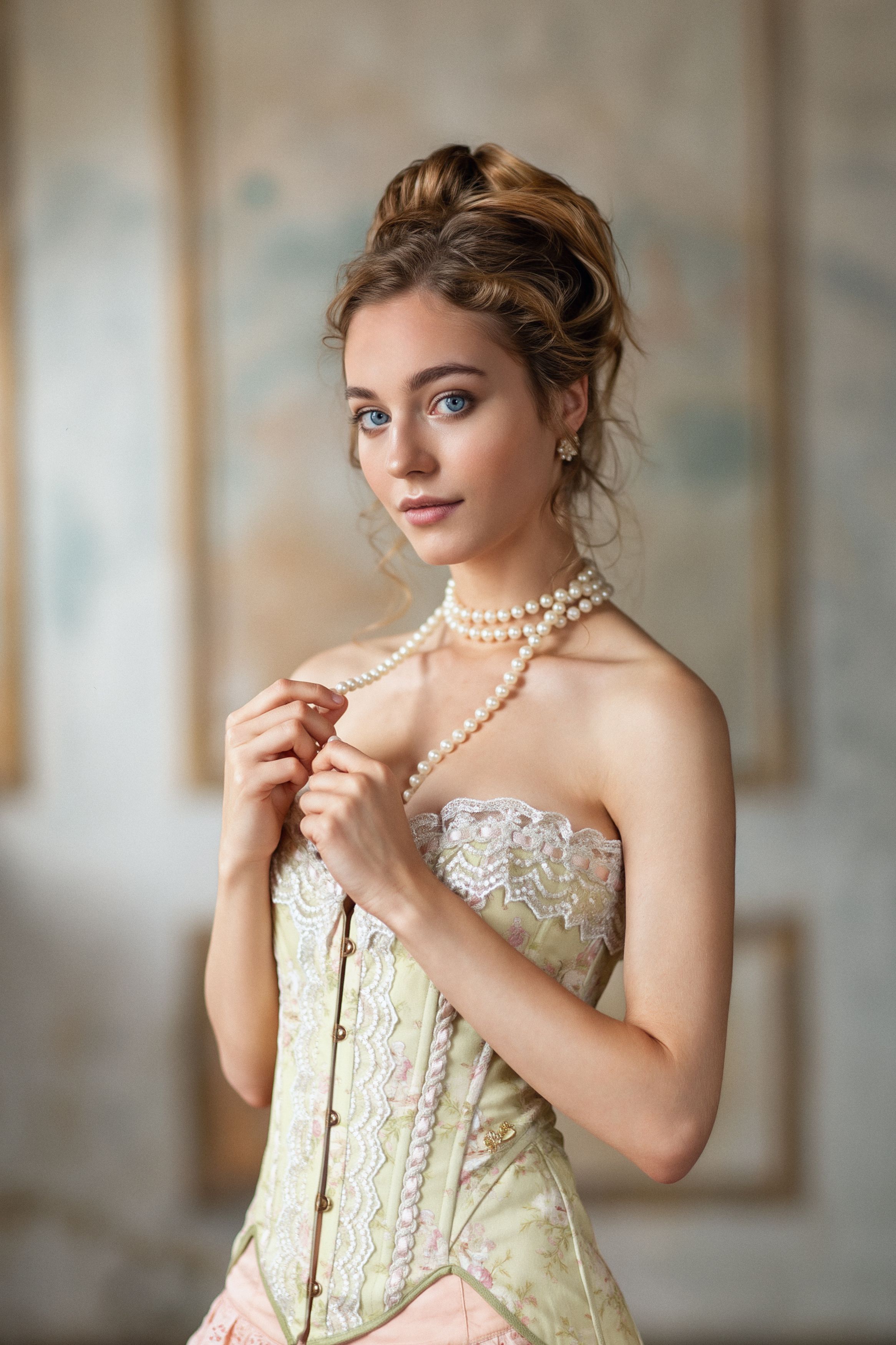 Дама в пастельном корсете с кружевной отделкой и жемчужным ожерельем позирует в светлом интерьере. Её прическа и макияж подчёркивают викторианскую эстетику. Фотография передаёт атмосферу изысканности и нежности, характерную для классической моды. Работа Анастасии Барминой.