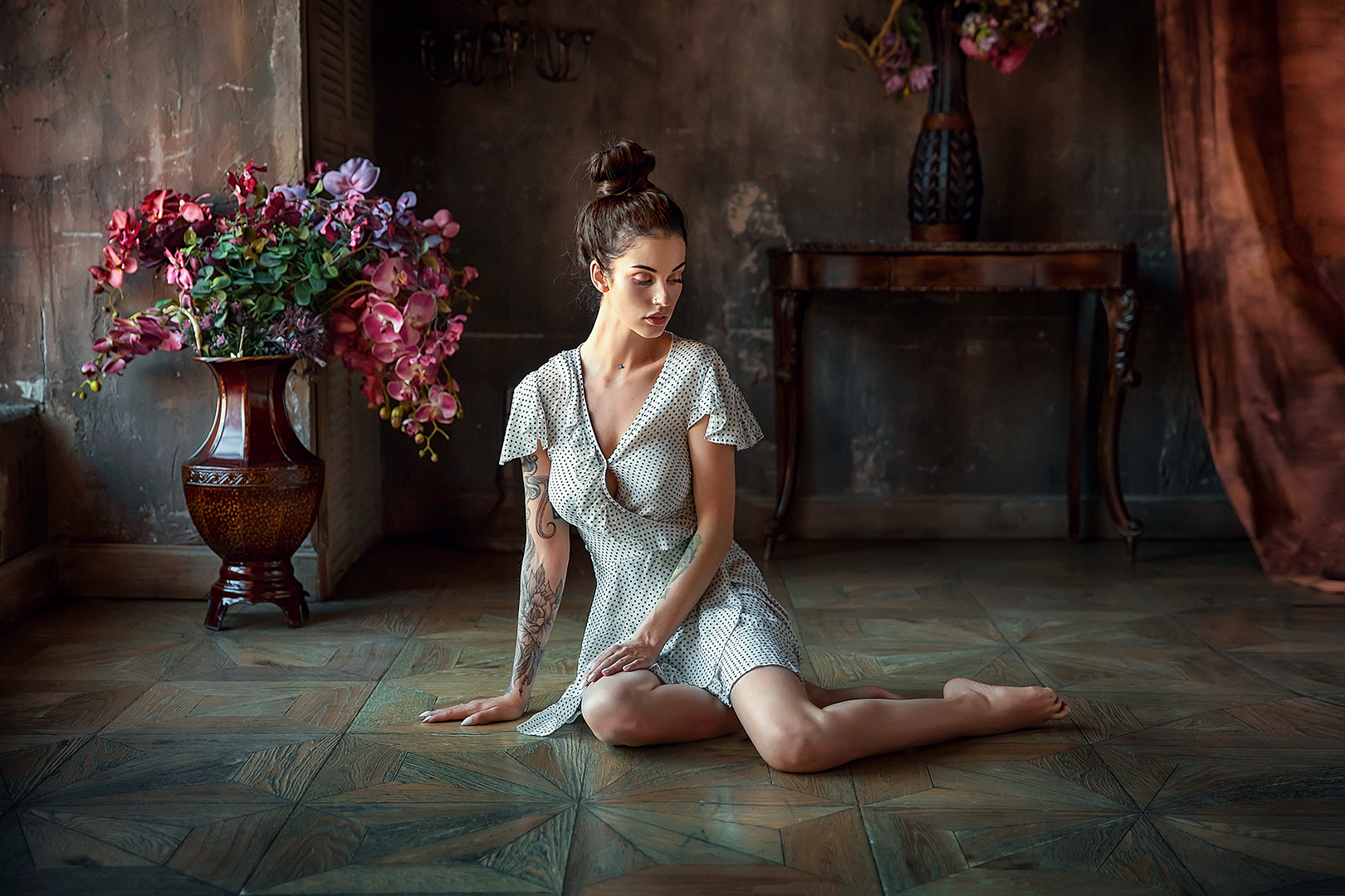 В старинном помещении с мраморным полом и пыльным светом сидит молодая женщина в нежном платье. Её поза — естественная, почти задумчивая. Рядом — вазы с яркими цветами, придающие сцене живость. Фотограф Анастасия Бармина передаёт атмосферу уединения и внутреннего покоя, где каждая деталь — от тату на руке до тени на стене — вносит свой оттенок в образ.