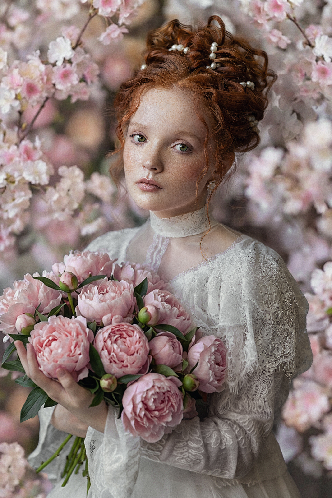 Ваша фотография — как сон в цветах. Красивая девушка с рыжими локонами, украшенными жемчугом, в нежном кружевном платье, держит букет розовых пионов. На фоне цветущих ветвей — почти мечта. Всё выдержано в мягких тонах, свет тёплый, а взгляд — тихий и задумчивый. 🌸✨