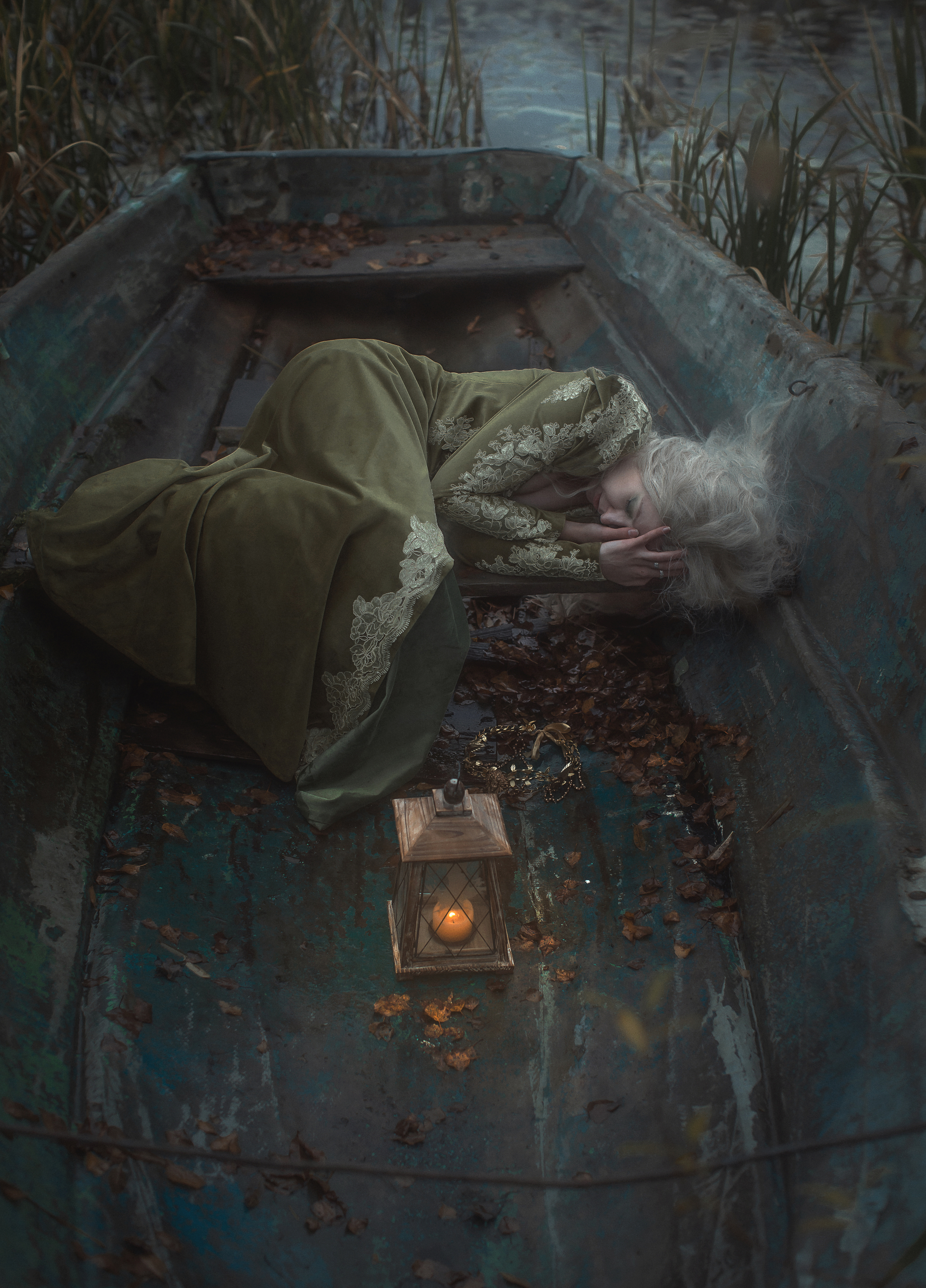 В сером тумане, среди зарослей и падающих листьев, лодка — как остров в забвении. В ней, под зелёным покрывалом, спит женщина с белыми волосами, лицо её — в полумраке, но в глазах — тишина. Рядом — фонарь, огонь которого не гаснет, будто хранит последнюю надежду. Это не сцена ухода, а пауза — между жизнью и памятью, между светом и тьмой. Фотография Шепелевой Татьяны застывает мгновение, где время остановилось, а душа — в покое.