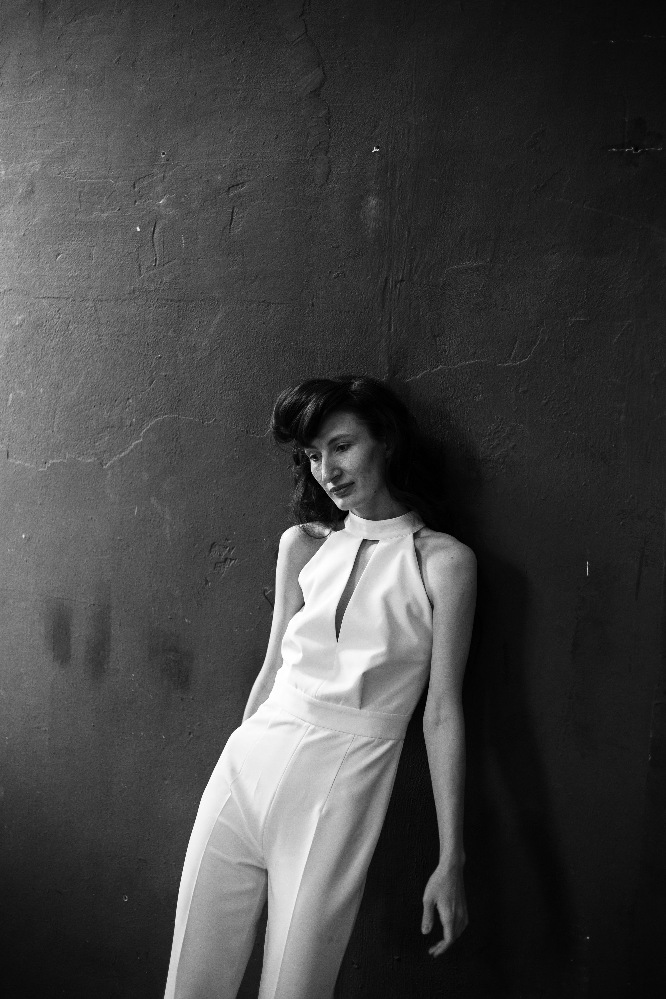 Женщина в белом костюме прислонилась к тёмной стене — контраст чёткий, поза расслабленная, но в ней что-то задумчивое. Снимок простой, но с налётом тишины.
