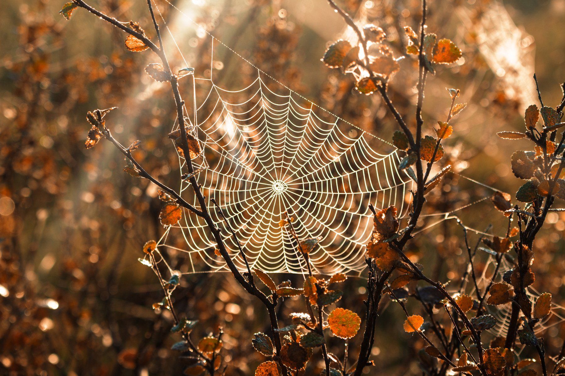 Да, самая обычная паутина с первыми лучами солнца превращается в " Золотое царство " острые солнечные лучи уже выныривали из-за пушистого, фиалкового облака и передо мной открывалось целое поле усыпанное этими жемчужными нитями .
