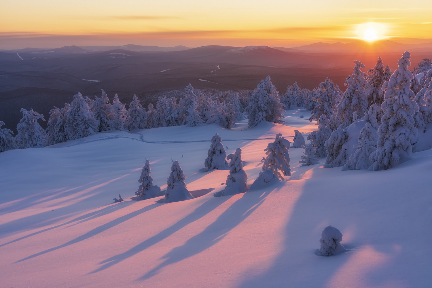 Вы, Анатолич, умело поймали свет — он ложится на снег мягкими розовыми полосами, а тени от деревьев растянулись, как следы по склону. Красота в простоте.